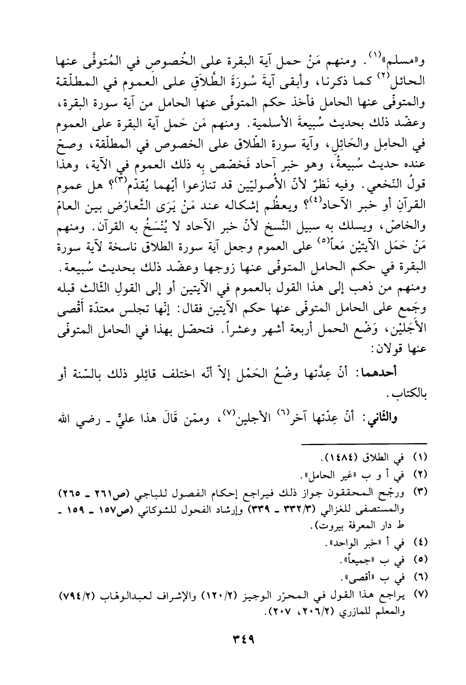 و ((مسلم)). ومنهم من حمل آية البقرة على الخصوص في المتوفى عنها الحائل كما ذكرنا، وأبقى آية يورة الطلاق على العموم في المطلقة والمتوفى عنها الحامل فأخذ حكم المتوفى عنها الحامل من آية سورة البقرة، وعضد ذلك بحديث سبيعة الأسلمية. ومنهم من حمل آية البقرة على العموم في الحامل والحائل، وآية سورة الطلاق على الخصوص في المطلقة، وصح عنده حديث سبيعة، وهو خبر آحاد فخصص به ذلك العموم في الآية، وهذا قول النخعي. وفيه نظر لأن الأصوليين قد تنازعوا أيهما يقدم؟ هل عموم القرآن أو خبر الآحاد؟ ويعظم إشكاله عند من يرى التعارض بين العام والخاص، ويسلك سبيل النسخ لأن خبر الآحاد لا ينسخ به القرآن. ومنهم من حمل الآيتين معًا على العموم وجعل آية سورة الطلاق ناسخة لآية سورة البقرة في حكم الحامل والمتوفى عنها زوجها وعضد ذلك بحديث سبيعة.