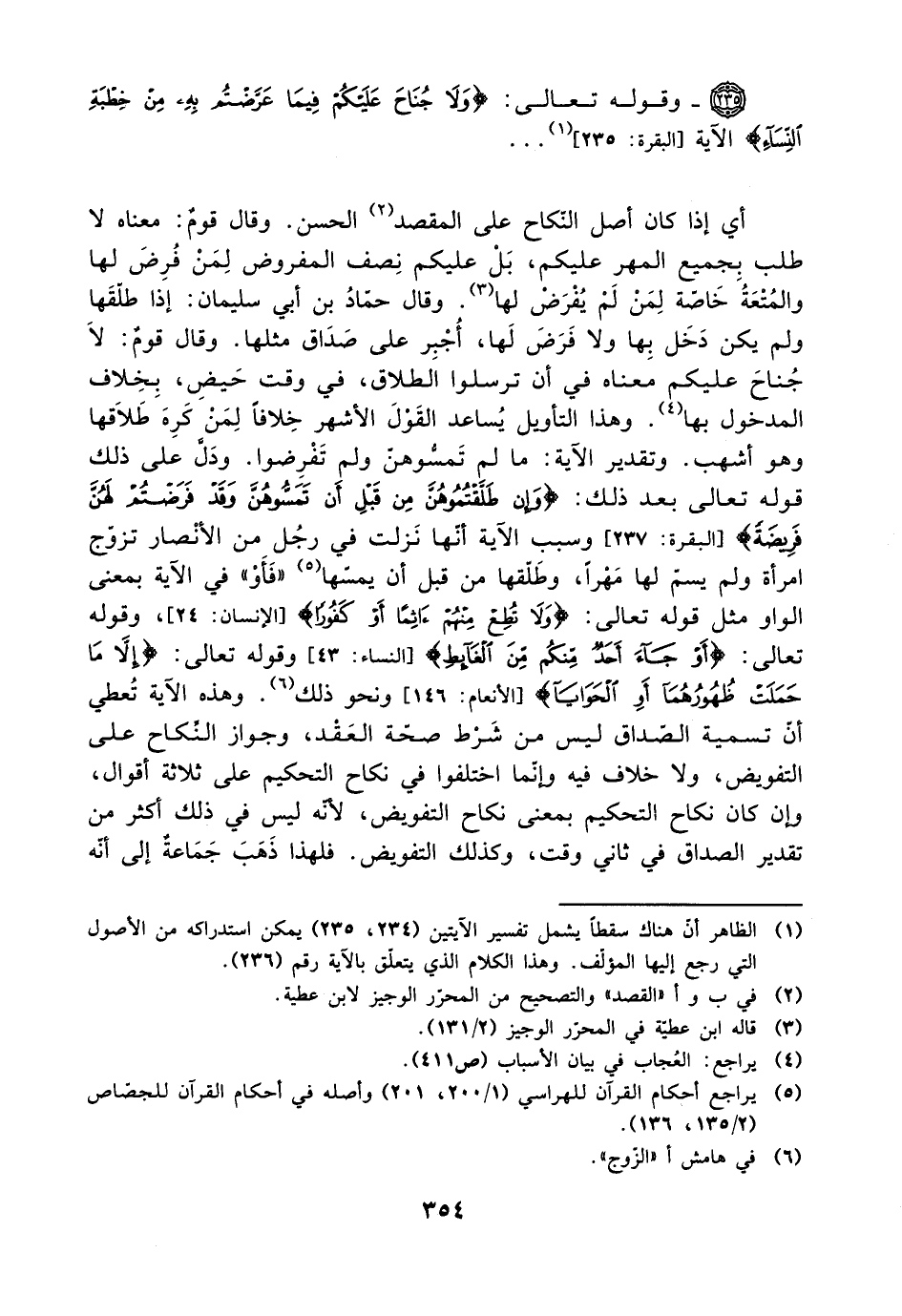 أي إذا كان الأصل النكاح على المقصد الحسن. وقال قوم: معناه لا طلب بجميع المهر عليكم، بل عليكم نصف المفروض لمن فرض لها والمتعة خاصة لمن لم يفرض لها. وقال حماد بن أبي سليمان: إذا طلقها ولم يكن دخل بها ولا فرض لها. وقال حماد بن أبي سليمان: إذا طلقها ولم يكن دخل بها ولا فرض لها، أجبر على صداق مثلها. وقال قوم: لا جناح عليكم معناه في أن ترسلوا الطلاق، في وقت الحيض، بخلاف المدخول بها. وهذا التأويل يساعد القول الأهر خلافًا لمن كره طلاقها وهو أشهب. وتقدير الآية: ما لم تمسوهن ولم تفرضوا. ودل على ذلك قوله تعالى بعد ذلك: {وإن طلقتموهن من قبل أن تمسوهن وقد فرضتم لهن فريضة} [البقرة: 237] وسبب من طلقها قبل أن يمسها ((فأو)) في الآبة بمعنى الواو مثل قوله تعالى: {أو جاء أحد منكم من الغائط} [النساء: 146] ونحو ذلك. وهذه الآية تعطي أن تسمية الصداق ليس من شرط صحة العقد، وجواز النكاح على التفويض، ولا خلاف فيه وإنما اختلفوا في نكاح التحكيم على ثلاثة أقوال، وإن كان نكاح التحكيم بمعنى نكاح التفويض، لأنه ليس في ذلك أكثر من تقدير الصداق في ثاني وقت، وكذلك التفويض. ولهذا ذهب جماعة إلى أنه