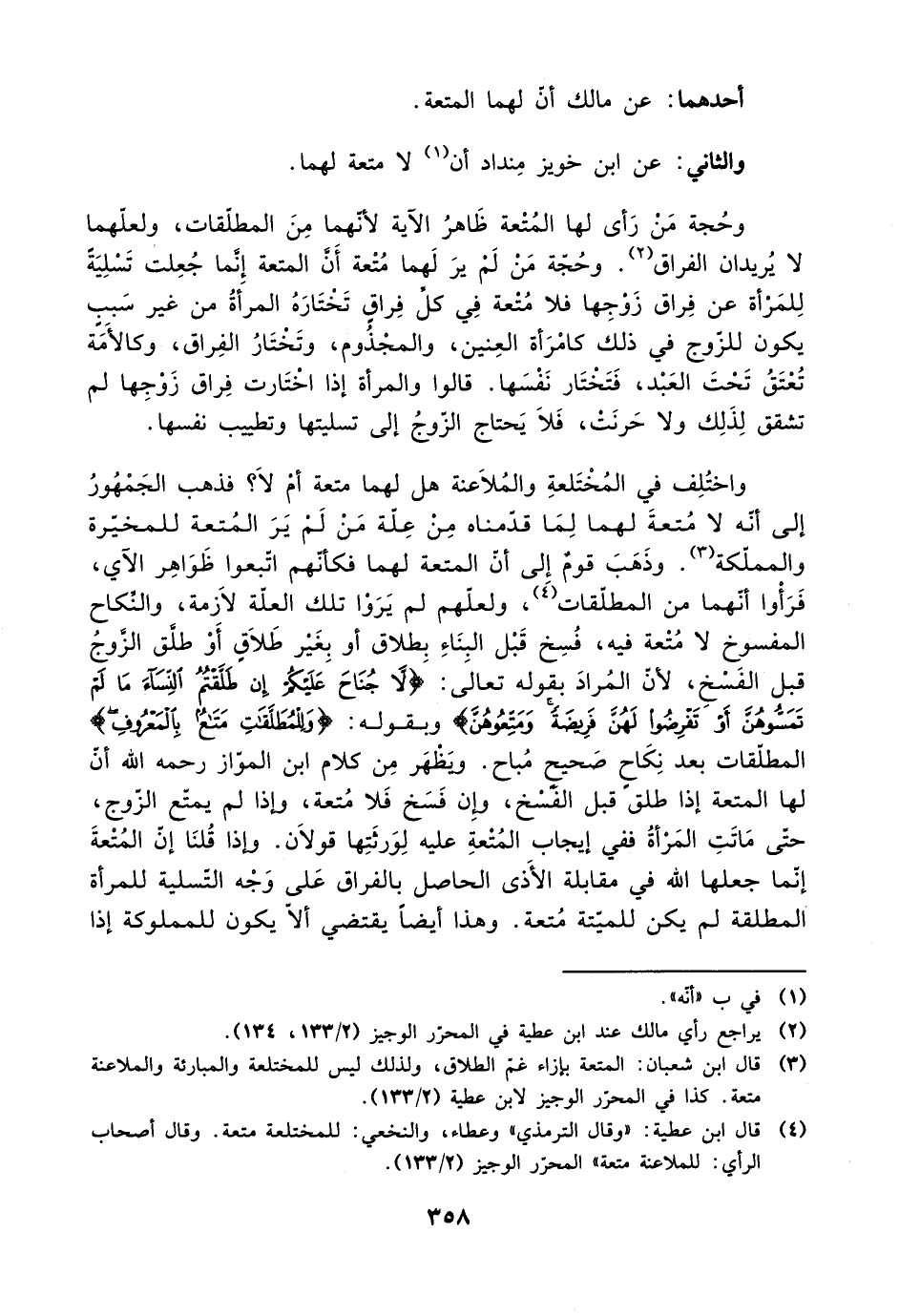 وحجة من رأى لها المتعة ظاهر الآية لأنهما من المطلقات، ولعلهما لا يريدان الفراق. وحجة من لم ير لهما متعة أن المتعة إنما جعلت تسلية للمرأة عن فراق زوجها فلا متعة في كل فراق تختاره المرأة من غير سبب يكون للزوج في ذلك كامرأة العنين، والمجذوم، وتختار الفراق، وكالأمة تعتق تحت العبد، فتختار نفسها. قالوا والمرأة إذا اختارت فراق زوجها لم تشقق لذلك ولا حرنت، فلا يحتاج الزوج إلى تسليتها وتطييب نفسها.