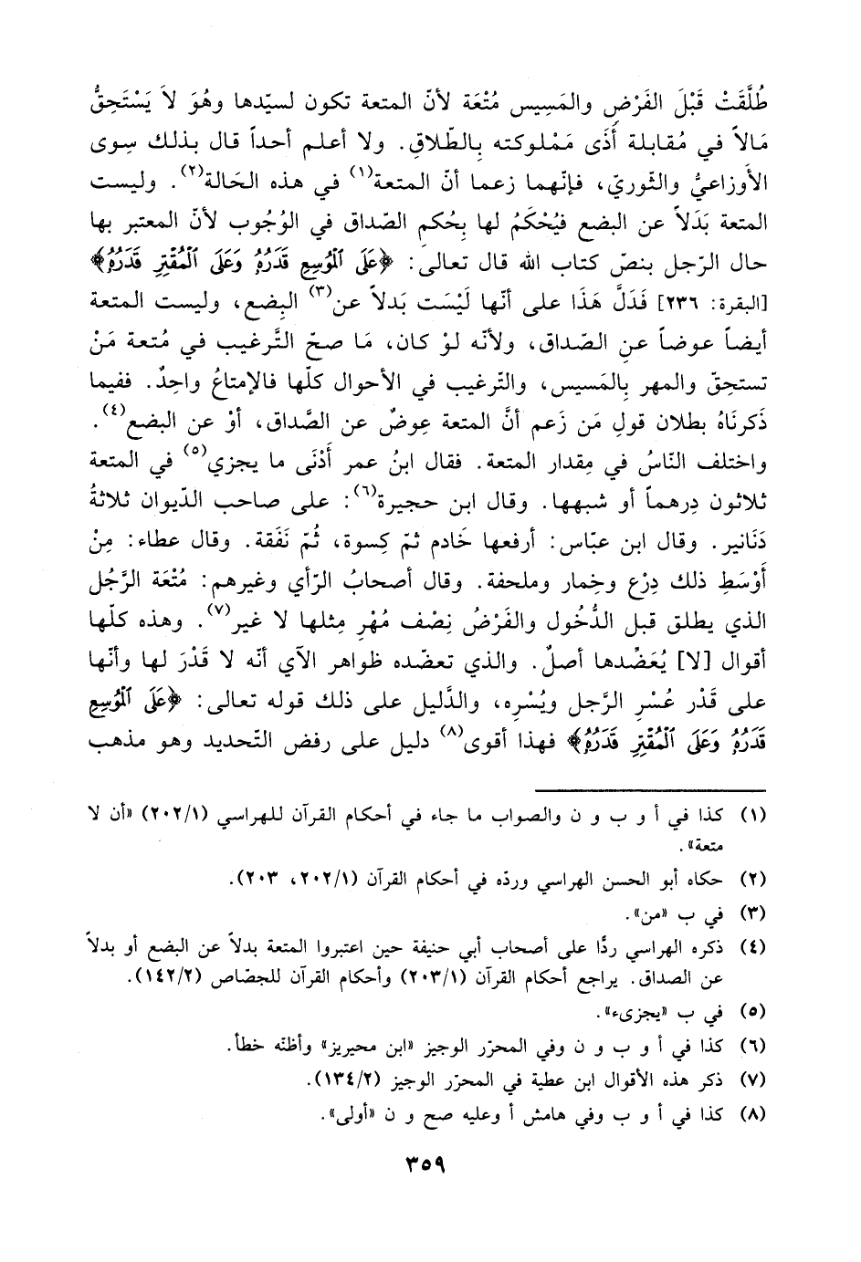 واختلف الناس في مقدار المتعة. فقال ابن عمر أدنى ما يجزي في المتعة ثلاثون درهمًا أو شبهها. وقال ابن حجيرة: على صاحب الديون ثلاثة دنانير. وقال ابن عباس: أرفعها خادم ثم كسوة، ثم نفقة. وقال عطاء: من أوسط ذلك درع وخمار وملحفة. وقال أصحاب الرأي وغيرهم: متعة الرجل الذي يطلق قبل الدخول والفرض نصف مهر مثلها لا غير. وهذه كلها أقوال [لا] يعضدها أصل. والذي تعضده ظواهر الآي أنه لا قدر للها وأنها على قدر عسر الرجل ويسره، والدليل على ذلك قوله تعالى: {على الموسع قدره وعلى المقتر قدره} فهذا أقوى دليل على رفض التحديد وهو مذهب