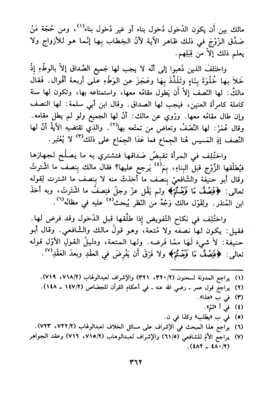واختلف في المرأة تقبض صداقها فتشتري به ما يصلح لجهازها فيطلقها الزوج قبل البناء، بم يرجع عليها؟ فقال ملاك بنصف ما اشترت وقال أبو حنيفة والشافعي بنصف ما أخذت منه لا بنصف ما اشترت لقوله تعالى: {فنصف ما فرضتم} ولم يقل عز وجل فنصف ما اشترت، وبه أخذ ابن المنذر. ولقول مالك وجه من النظر يبحث عليه في مظانه.