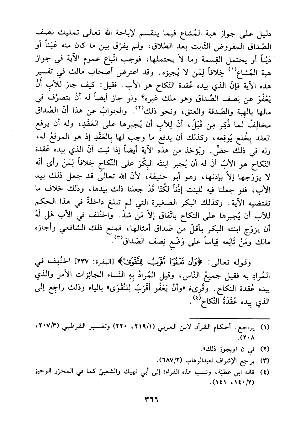دليل على جواز هبة المشاع فيما ينقسم لإباحة الله تعالى تمليك نصف الصداق المفروض الثابت بعد الطلاق، ولم يفرق بين ما كان منه عينًا أو دينًا أو يحتمل القسمة وما لا يحتملها، فوجب اتباع عموم الآية في جواز هبة المشاع خلافًا لمن لا يجيزه. وقد اعترض أصحاب مالك في تفسير هذه الآية فإن الذي بيده عقدة النكاح هو الاب. فقيل: كيف جاز للأب أن يعفو عن نصف الصداق وهو ملك غيره؟ ولو جاز أيضًا له أن يتصرف في مالها بالهبة والصدقة والعتق، ونحو ذلك. والجواب عن هذا أن الصداق مخالف لما ذكر من قبل، أن للأب أن يجبرها على العقد، وله أن يرفع العقد بخلع يوقعه، كذلك لأن يدفع ما وجب لها بالعقد إذ هو الموقع له، وله في ذلك حض. ويؤخذ من هذه الآية أيضًا إذا ثبت أن الذي بيده عقدة المكاح هو الأب أن له أن يجبر ابنته البكر على النكاح خلافًا لمن رأى أنه ال يزوجها إلا بإذنها، وهو أبو حنيفة، لأن الله تعالى قد جعب ذلك بيد الأب، فلو جعلنا فيه للبنت إذنًا بكنا قد جعلنا ذلك بيدها، وذلك خلاف ما تقتضيه الآية. وكذلك البكر الصغيرة التي لم تبلغ داخلة في هذا الحكم للأب أن يجبرها على النكاح باتفاق إلا من شذ. واختلف في الأب هل له أن يزوج ابنته البكر بأقل من صداق امثالها، فمنع ذلك الشافعي وأجازه مالك ومن تابعه قياسًا على وضع نصف الصداق.