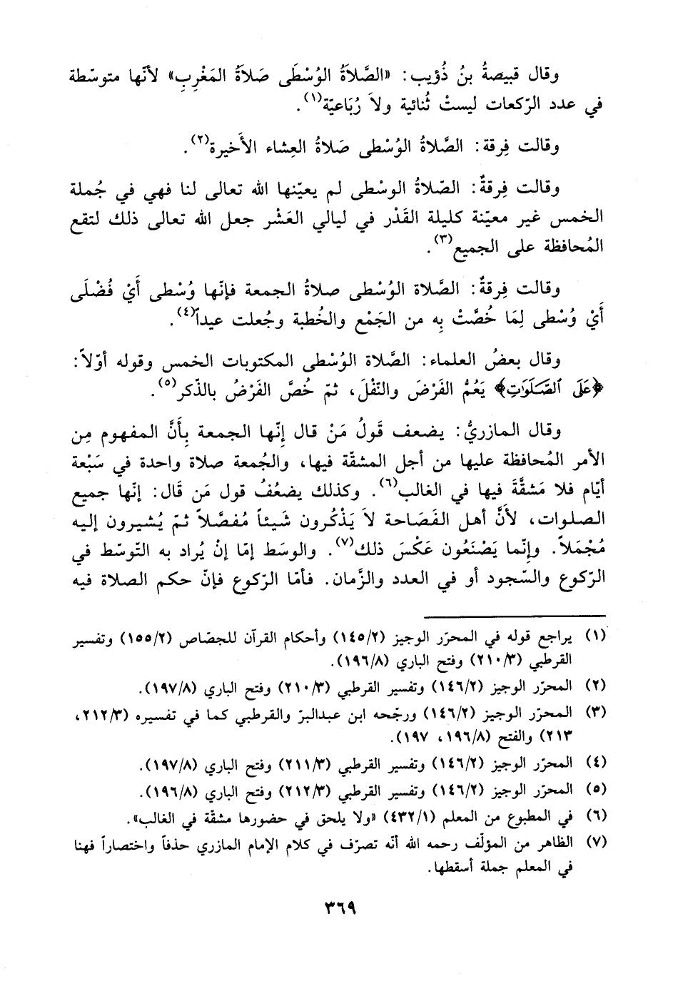 وقال المازري: يضعف قول من قال إنها الجمعة بأن المفهوم من الأمر المحافظة عليها من أجل المشقة فيها، والجمعة صلاة واحدة في سبعة أيام فلا مشقة فيها في الغالب. وكذلك يضعف قول من قال: إنها جميع الصلوات، لأن أهل الفصاحة لا يذكرون شيئًا مفصلًا ثم يشيرون إليه مجملًا. وإنما يصنعون عكس ذلك. والوسط إما أن يراد به التوسط في الركوع والسجود أو في العدد والزمان. فأما الركوع فإن حكم الصلاة فيه