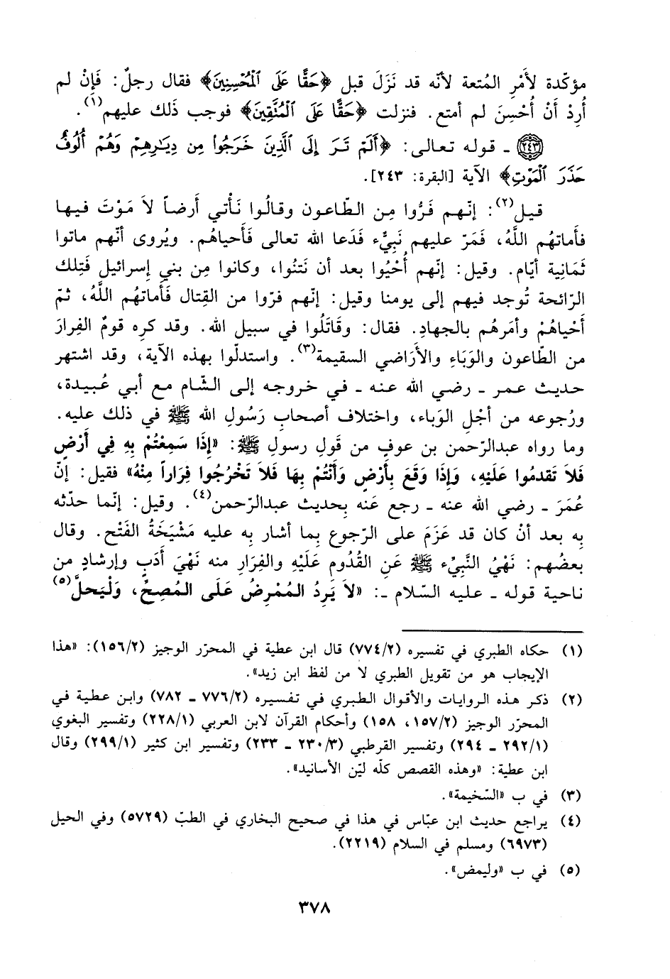 وما رواه عبد الرحمن بن عوف من قول رسول الله صلى الله عليه وسلم: ((إذا سمعتم به في أرض فلا تقدموا عليه، وإذا وقع بأرض وأنتم بها فلا تخرجوا فرارًا منه)) فقيل: إن عمر -رضي الله عنه- رجع عنه بحديث عبد الرحمن. وقيل: إنما حدثه بعد أن كان قد عزم على الرجوع بما أشار به عليه مشيخة الفتح. وقال بعضهم: نهي النبي صلى الله عليه وسلم عن القدوم عليه والفرار منه نهي أدب وإرشاد من ناحية قوله -عليه السلام-: ((لا يرد الممرض على المصح، وليحل