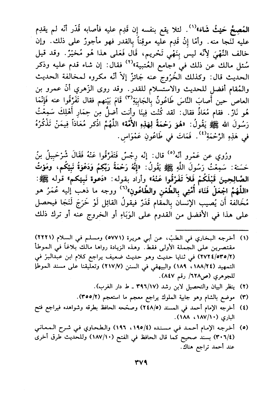 وروي عن عمرو أنه قال: إنه رجس فتفرقوا عنه فقال شرحبيل بن حسنة: سمعت رسول الله صلى الله عليه وسلم يقول: ((إنه رحمة ربكم ودعوة نبيكم، وموت الصالحين قبلكم فلا تفرقوا عنه)) وأراد بقوله: ((دعوة نبيكم)) قوله صلى الله عليه وسلم: ((اللهم اجعل فناء أمتي بالطعن والطاعون)) ووجه ما ذهب إليه عمر هو مخالفة أن يصيب الإنسان بالمقام قدر فيقول القائل لو خرج لنجا فيحصل على هذا في الأفضل من القدوم على الوباء أو الخروج عنه أو ترك ذلك