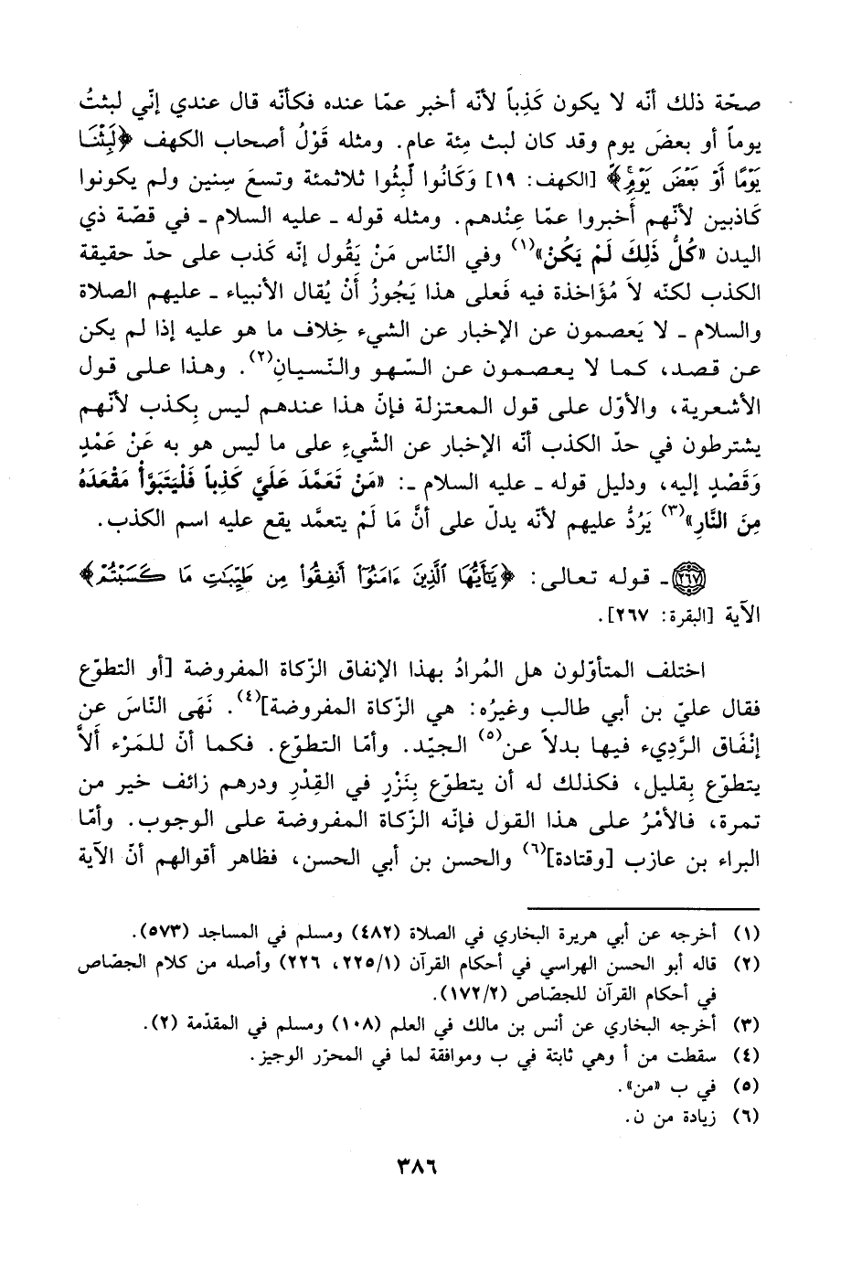 اختلف المتأولون هل المراد بهذا الإنفاق الزكاة المفروضة [أو التطوع فقال علي بن أبي طالب وغيره: هي الزكاة المفروضة]. ونهى الناس عن إنفاق الرديء فيها بدلًا عن الجيد. وأما التطوع فكما أن للمرء ألا يتطوع بقليل، فكذلك له أن يتطوع بنزر في القدر ودرهم زائف خير من تمرة، فالأمر على هذا القول فإنه الزكاة المفروضة على الوجوب. وأما البراء بن عازب [وقتادة] والحسن بن أبي الحسن، فظاهر أقوالهم أن الآية