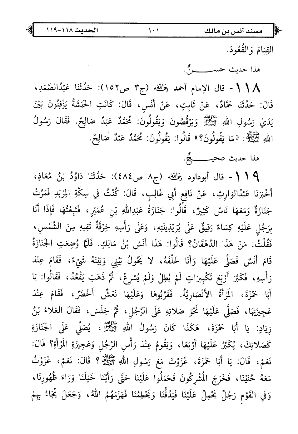 118 - قال الإمام أحمد رحمه الله (ج 3 ص 152): حدثنا عبد الصمد قال حدثنا حماد عن ثابت عن أنس قال: كانت الحبشة يزفنون بين يدي رسول الله صلى الله عليه وعلى آله وسلم ويرقصون ويقولون محمد عبد صالح فقال رسول الله صلى الله عليه وعلى آله وسلم «ما يقولون؟ » قالوا يقولون محمد عبد صالح.