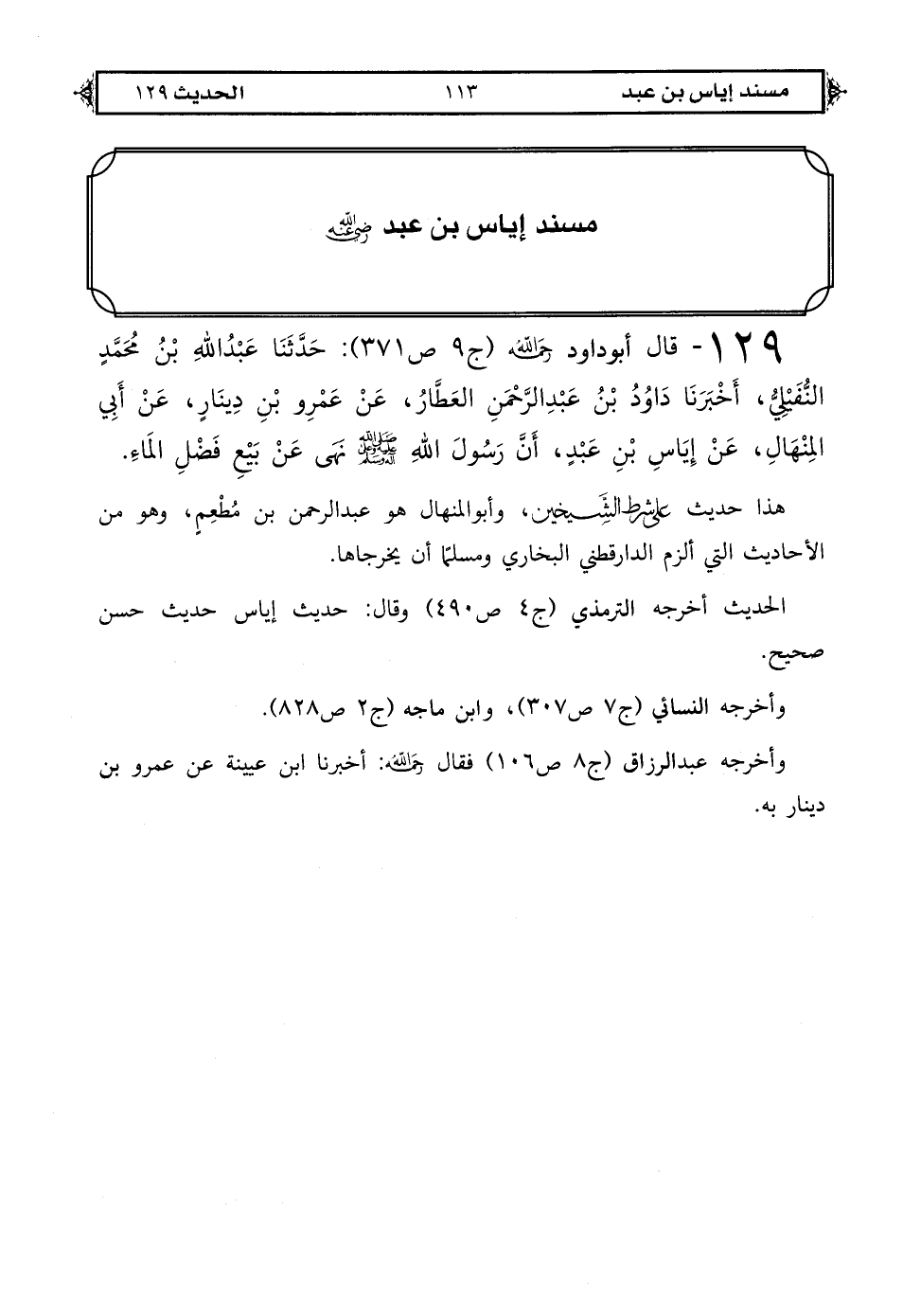 129 - قال أبو داود رحمه الله (ج 9 ص 371): حَدَّثَنَا عَبْدُ اللهِ بْنُ مُحَمَّدٍ النُّفَيْلِيُّ أخبرَنَا دَاوُدُ بْنُ عَبْدِ الرَّحْمَنِ الْعَطَّارُ عَنْ عَمْرِو بْنِ دِينَارٍ عَنْ أَبِي الْمِنْهَالِ عَنْ إِيَاسِ بْنِ عَبْدٍ: أَنَّ رَسُولَ اللهِ صَلَّى اللهُ عَلَيْهِ وَعَلَى آلِهِ وَسَلَّمَ نَهَى عَنْ بَيْعِ فَضْلِ الْمَاءِ.