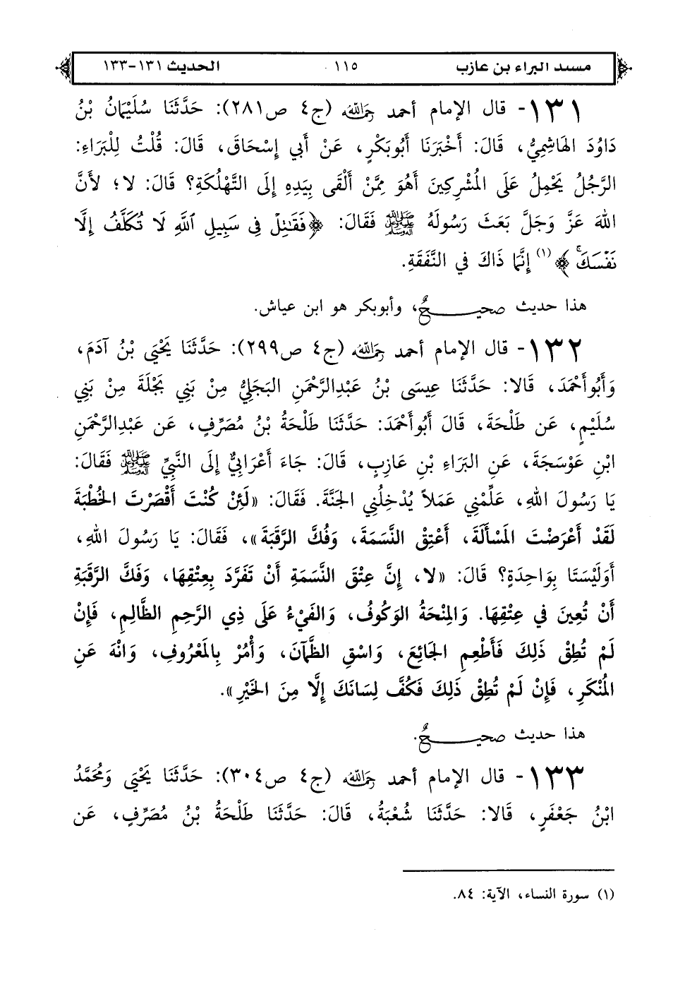 132 - قال الإمام أحمد رحمه الله (ج 4 ص 299): حدثنا يحيى بن آدم وأبو أحمد قالا حدثنا عيسى بن عبد الرحمن البجلي من بني بجلة من بني سليم عن طلحة. قال أبو أحمد حدثنا طلحة بن مصرف عن عبد الرحمن بن عوسجة عن البراء بن عازب قال: جاء أعرابي إلى النبي صلى الله عليه وعلى آله وسلم فقال يا رسول الله علمني عملًا يدخلني الجنة فقال «لئن كنت أقصرت الخطبة لقد أعرضت المسألة أعتق النسمة وفك الرقبة» فقال يا رسول الله أو ليستا بواحدة قال «لا إن عتق النسمة أن تفرد بعتقها وفك الرقبة أن تعين في عتقها والمنحة الوكوف والفيء على ذي الرحم الظالم فإن لم تطق ذلك فأطعم الجائع واسق الظمآن وأمر بالمعروف وانه عن المنكر فإن لم تطق ذلك فكف لسانك إلا من الخير».