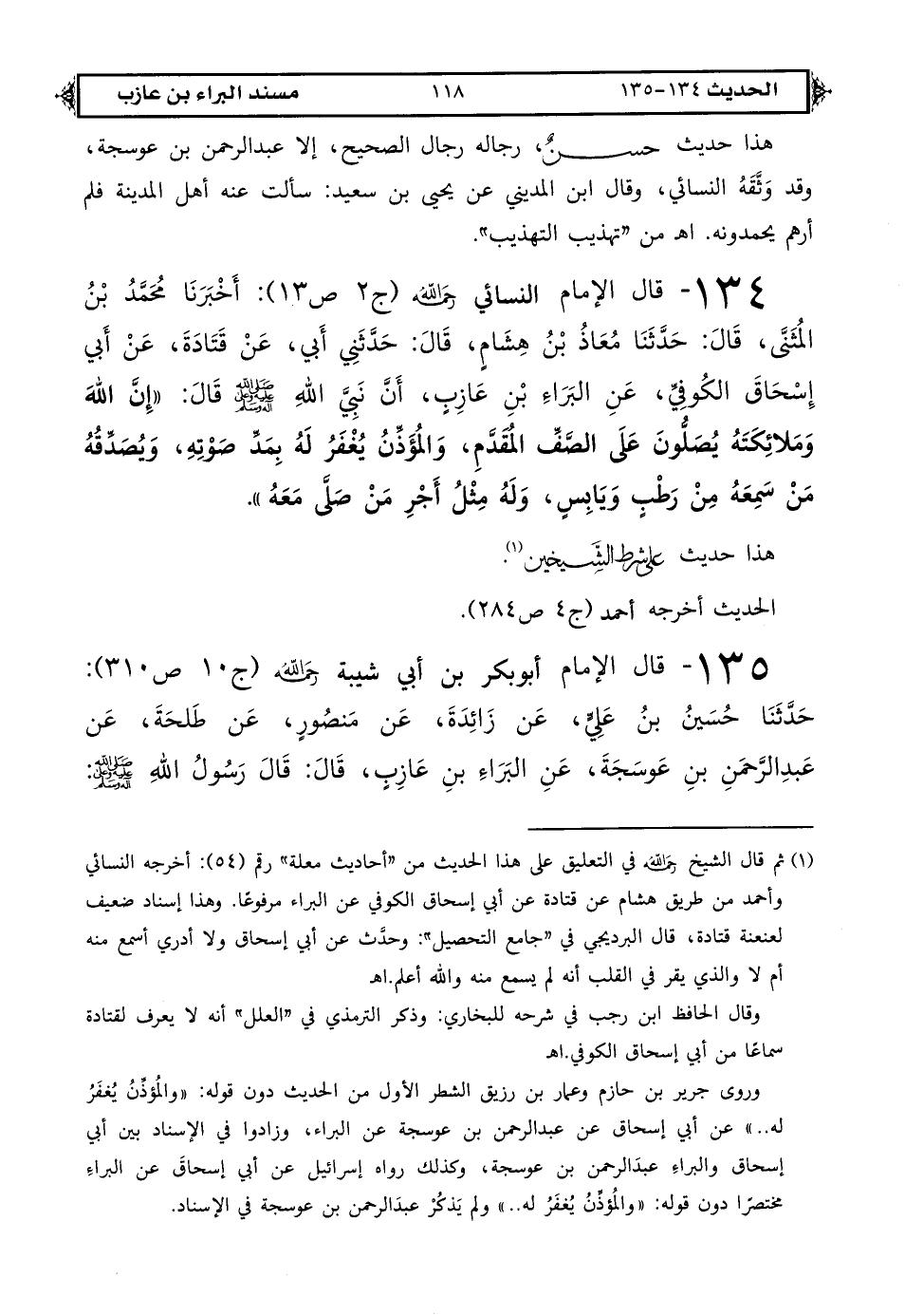 134 - قال الإمام النسائي رحمه الله (ج 2 ص 13): أَخْبَرَنَا مُحَمَّدُ بْنُ الْمُثَنَّى قَالَ حَدَّثَنَا مُعَاذُ بْنُ هِشَامٍ قَالَ حَدَّثَنِي أَبِي عَنْ قَتَادَةَ عَنْ أَبِي إِسْحَاقَ الْكُوفِيِّ عَنْ الْبَرَاءِ بْنِ عَازِبٍ: أَنَّ نَبِيَّ اللهِ صَلَّى اللهُ عَلَيْهِ وَعَلَى آلِهِ وَسَلَّمَ قَالَ «إِنَّ اللهَ وَمَلَائِكَتَهُ يُصَلُّونَ عَلَى الصَّفِّ الْمُقَدَّمِ وَالْمُؤَذِّنُ يُغْفَرُ لَهُ بِمَدِّ صَوْتِهِ وَيُصَدِّقُهُ مَنْ سَمِعَهُ مِنْ رَطْبٍ وَيَابِسٍ وَلَهُ مِثْلُ أَجْرِ مَنْ صَلَّى مَعَهُ».