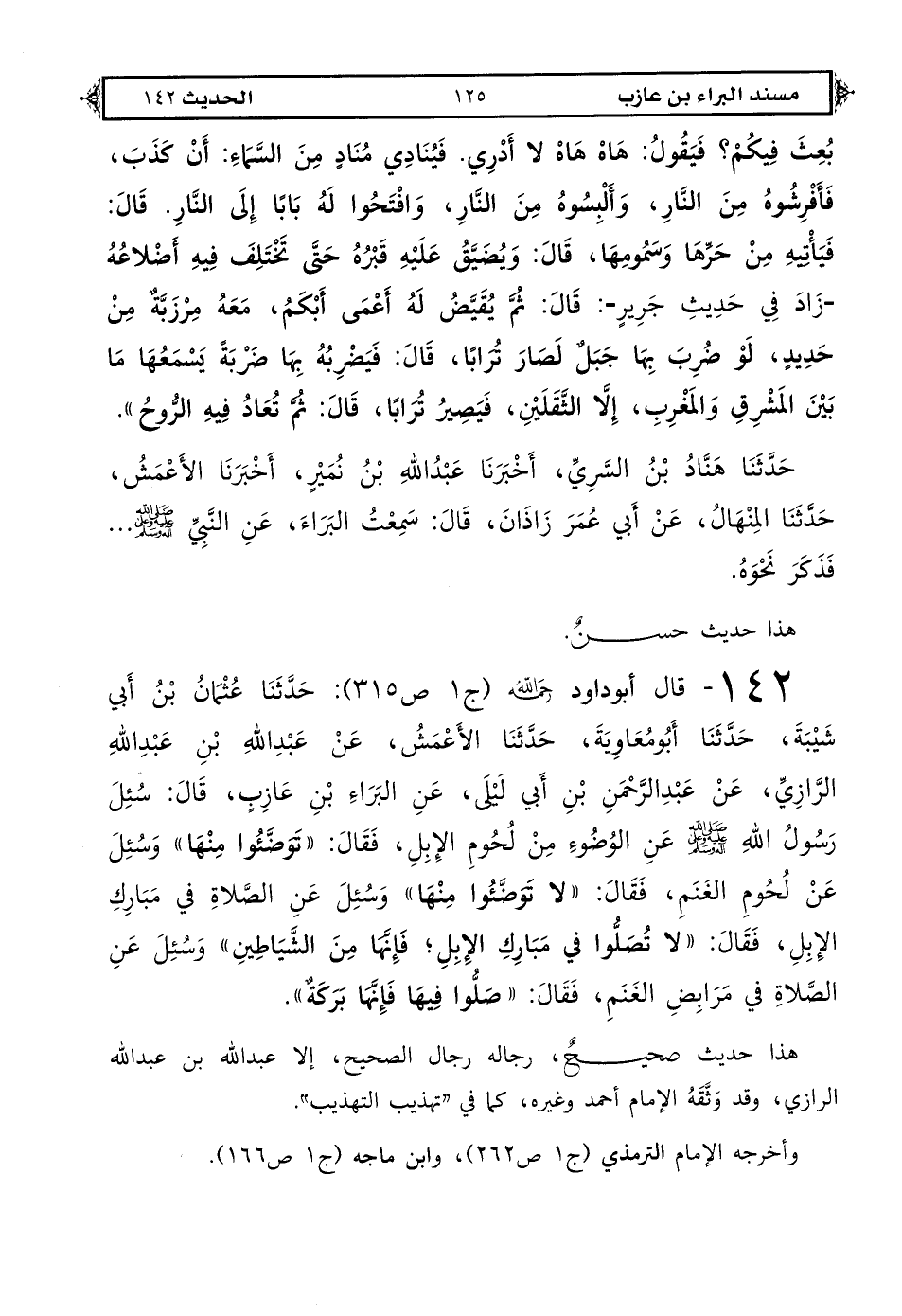 142 - قال أبو داود رحمه الله (ج 1 ص 315): حَدَّثَنَا عُثْمَانُ بْنُ أَبِي شَيْبَةَ حَدَّثَنَا أَبُو مُعَاوِيَةَ حَدَّثَنَا الْأَعْمَشُ عَنْ عَبْدِ اللهِ بْنِ عَبْدِ اللهِ الرَّازِيِّ عَنْ عَبْدِ الرَّحْمَنِ بْنِ أَبِي لَيْلَى عَنْ الْبَرَاءِ بْنِ عَازِبٍ قَالَ: سُئِلَ رَسُولُ اللهِ صَلَّى اللهُ عَلَيْهِ وَعَلَى آلِهِ وَسَلَّمَ عَنْ الْوُضُوءِ مِنْ لُحُومِ الْإِبِلِ فَقَالَ «تَوَضَّئُوا مِنْهَا» وَسُئِلَ عَنْ لُحُومِ الْغَنَمِ فَقَالَ «لَا تَوَضَّئُوا مِنْهَا» وَسُئِلَ عَنْ الصَّلَاةِ فِي مَبَارِكِ الْإِبِلِ فَقَالَ «لَا تُصَلُّوا فِي مَبَارِكِ الْإِبِلِ فَإِنَّهَا مِنْ الشَّيَاطِينِ» وَسُئِلَ عَنْ الصَّلَاةِ فِي مَرَابِضِ الْغَنَمِ فَقَالَ «صَلُّوا فِيهَا فَإِنَّهَا بَرَكَةٌ».