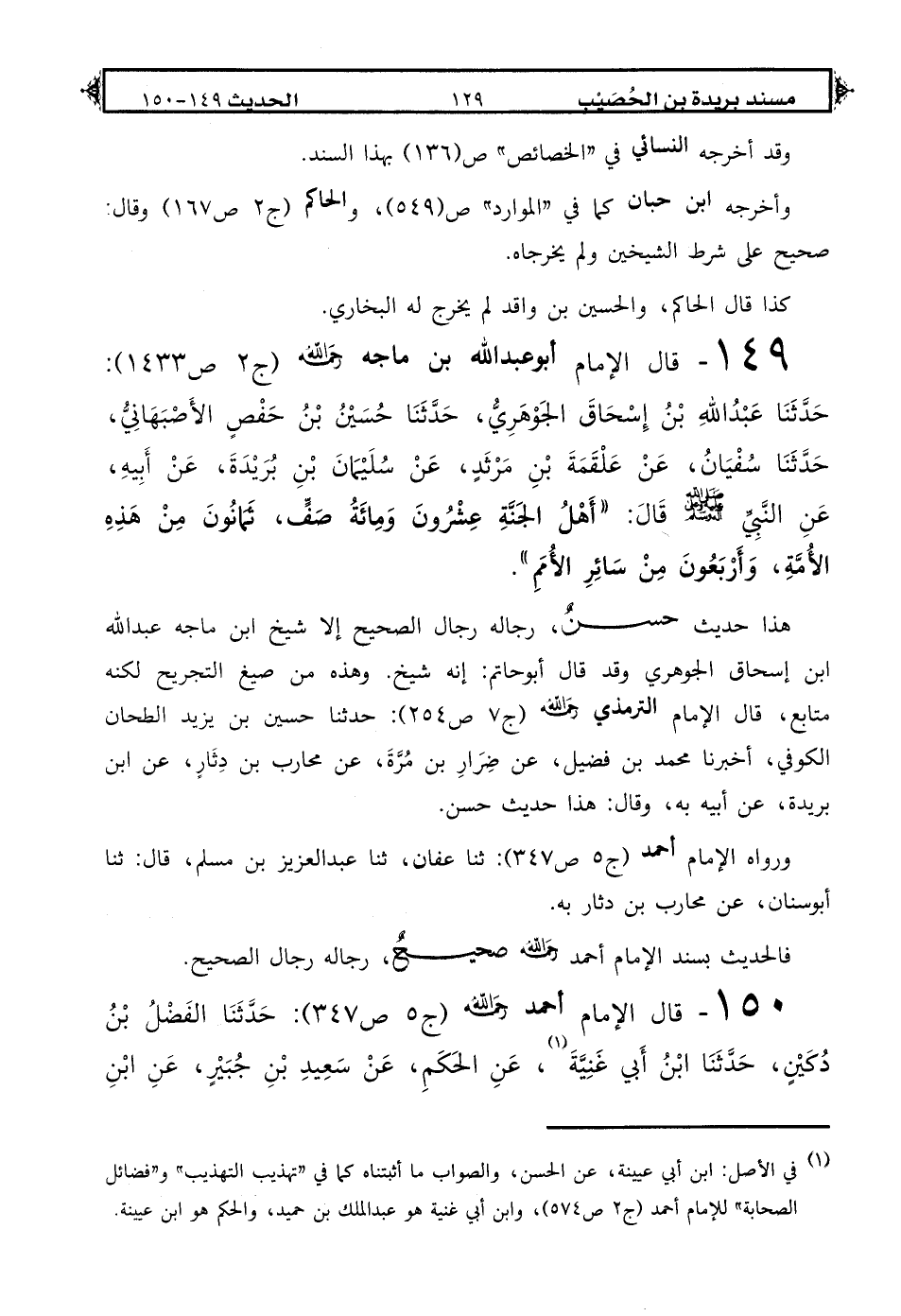 149 - قال الإمام أبو عبد الله بن ماجه رحمه الله (ج 2 ص 1433): حَدَّثَنَا عَبْدُ اللهِ بْنُ إِسْحَاقَ الْجَوْهَرِيُّ حَدَّثَنَا حُسَيْنُ بْنُ حَفْصٍ الْأَصْبَهَانِيُّ حَدَّثَنَا سُفْيَانُ عَنْ عَلْقَمَةَ بْنِ مَرْثَدٍ عَنْ سُلَيْمَانَ بْنِ بُرَيْدَةَ عَنْ أَبِيهِ: عَنْ النَّبِيِّ صَلَّى اللهُ عَلَيْهِ وَعَلَى آلِهِ وَسَلَّمَ قَالَ «أَهْلُ الْجَنَّةِ عِشْرُونَ وَمِائَةُ صَفٍّ ثَمَانُونَ مِنْ هَذِهِ الْأُمَّةِ وَأَرْبَعُونَ مِنْ سَائِرِ الْأُمَمِ».