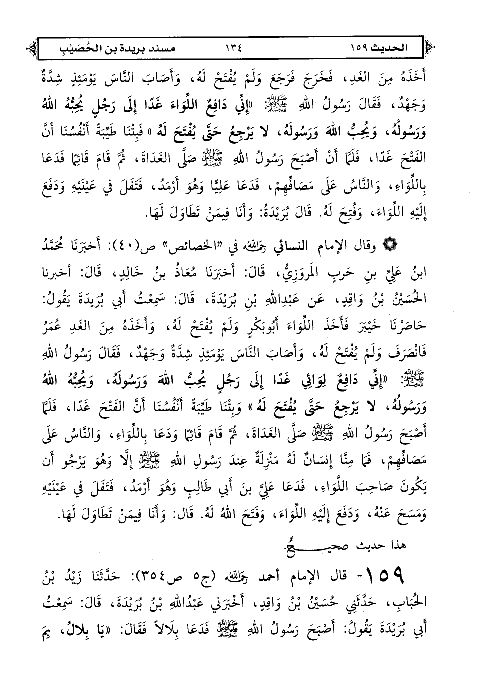 159 - قال الإمام أحمد رحمه الله (ج 5 ص 354): حدثنا زيد بن الحباب حدثني حسين بن واقد أخبرني عبد الله بن بريدة قال سمعت أبي بريدة يقول: أصبح رسول الله صلى الله عليه وعلى آله وسلم فدعا بلالًا فقال «يا بلال بم [ص: 135] سبقتني إلى الجنة ما دخلت الجنة قط إلا سمعت خشخشتك أمامي إني دخلت البارحة الجنة فسمعت خشخشتك فأتيت على قصر من ذهب مرتفع مشرف فقلت لمن هذا القصر قالوا لرجل من العرب قلت أنا عربي لمن هذا القصر قالوا لرجل من المسلمين من أمة محمد قلت فأنا محمد لمن هذا القصر قالوا لعمر بن الخطاب» فقال رسول الله صلى الله عليه وعلى آله وسلم «لولا غيرتك يا عمر لدخلت القصر» فقال يا رسول الله ما كنت لأغار عليك قال وقال لبلال «بم سبقتني إلى الجنة؟ » قال ما أحدثت إلا توضأت وصليت ركعتين فقال رسول الله صلى الله عليه وعلى آله وسلم «بهذا».