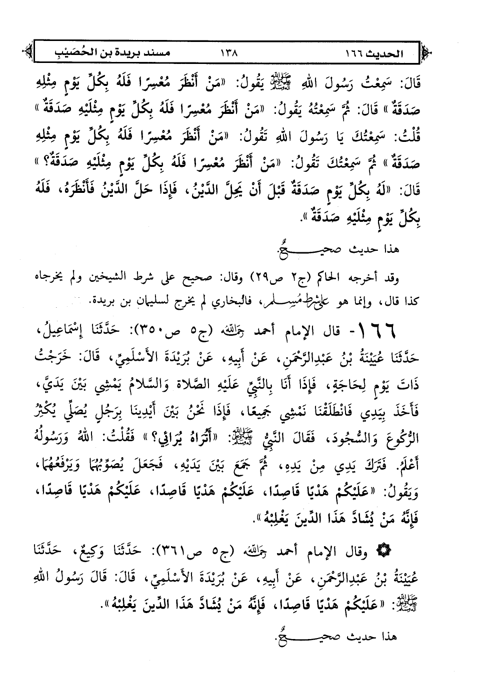 166 - قال الإمام أحمد رحمه الله (ج 5 ص 350): حدثنا إسماعيل حدثنا عيينة بن عبد الرحمن عن أبيه عن بريدة الأسلمي قال: خرجت ذات يوم لحاجة فإذا أنا بالنبي صلى الله عليه وعلى آله وسلم يمشى بين يدي فأخذ بيدي فانطلقنا نمشي جميعًا فإذا نحن بين أيدينا برجل يصلي يكثر الركوع والسجود فقال النبي صلى الله عليه وعلى آله وسلم «أتراه يرائي؟ » فقلت الله ورسوله أعلم فترك يدي من يده ثم جمع بين يديه فجعل يصوبهما ويرفعهما ويقول «عليكم هديًا قاصدًا عليكم هديًا قاصدًا عليكم هديًا قاصدًا فإنه من يشاد هذا الدين يغلبه».