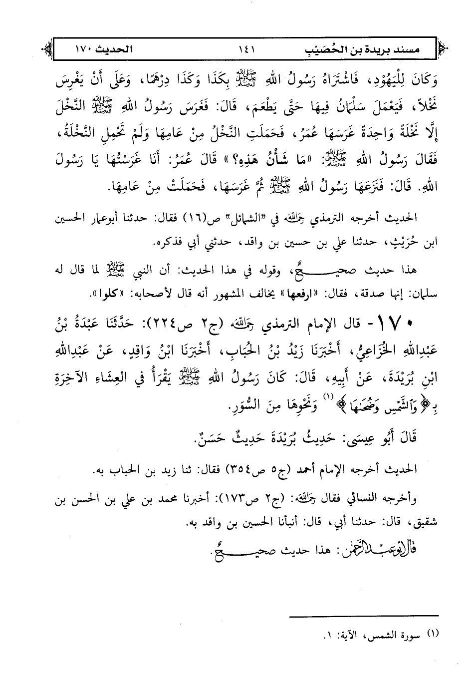 170 - قال الإمام الترمذي رحمه الله (ج 2 ص 224): حَدَّثَنَا عَبْدَةُ بْنُ عَبْدِ اللهِ الْخُزَاعِيُّ أخبرَنَا زَيْدُ بْنُ الْحُبَابِ أخبرَنَا ابْنُ وَاقِدٍ عَنْ عَبْدِ اللهِ بْنِ بُرَيْدَةَ عَنْ أَبِيهِ قَالَ: كَانَ رَسُولُ اللهِ صَلَّى اللهُ عَلَيْهِ وَعَلَى آلِهِ وَسَلَّمَ يَقْرَأُ فِي الْعِشَاءِ الْآخِرَةِ بِـ {وَالشَّمْسِ وَضُحَاهَا} (1) وَنَحْوِهَا مِنْ السُّوَرِ.