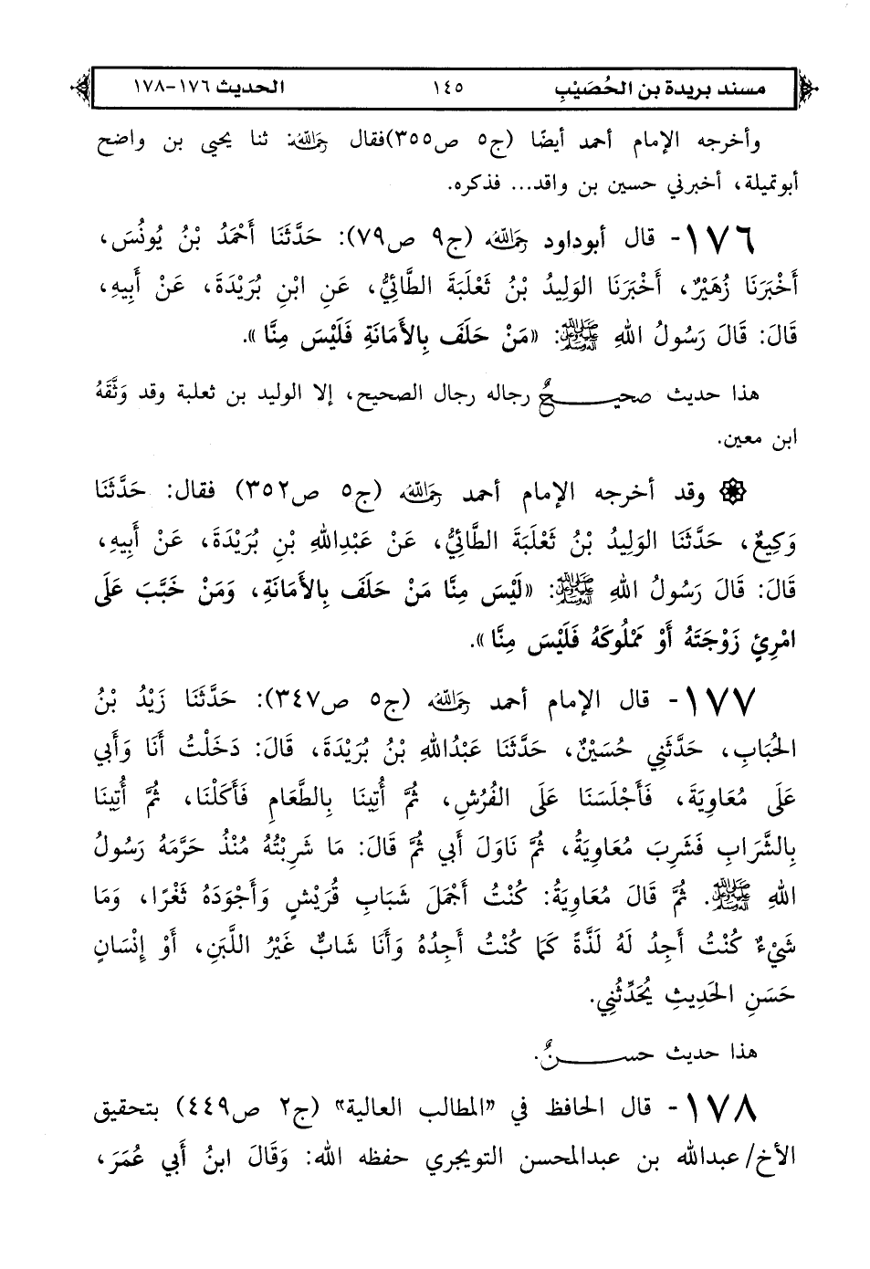 177 - قال الإمام أحمد رحمه الله (ج 5 ص 347): حدثنا زيد بن الحباب حدثني حسين حدثنا عبد الله بن بريدة قال: دخلت أنا وأبي على معاوية فأجلسنا على الفرش ثم أتينا بالطعام فأكلنا ثم أتينا بالشراب فشرب معاوية ثم ناول أبي ثم قال ما شربته منذ حرمه رسول الله صلى الله عليه وعلى آله وسلم ثم قال معاوية كنت أجمل شباب قريش وأجوده ثغرًا وما شيء كنت أجد له لذة كما كنت أجده وأنا شاب غير اللبن أو إنسان حسن الحديث يحدثني.