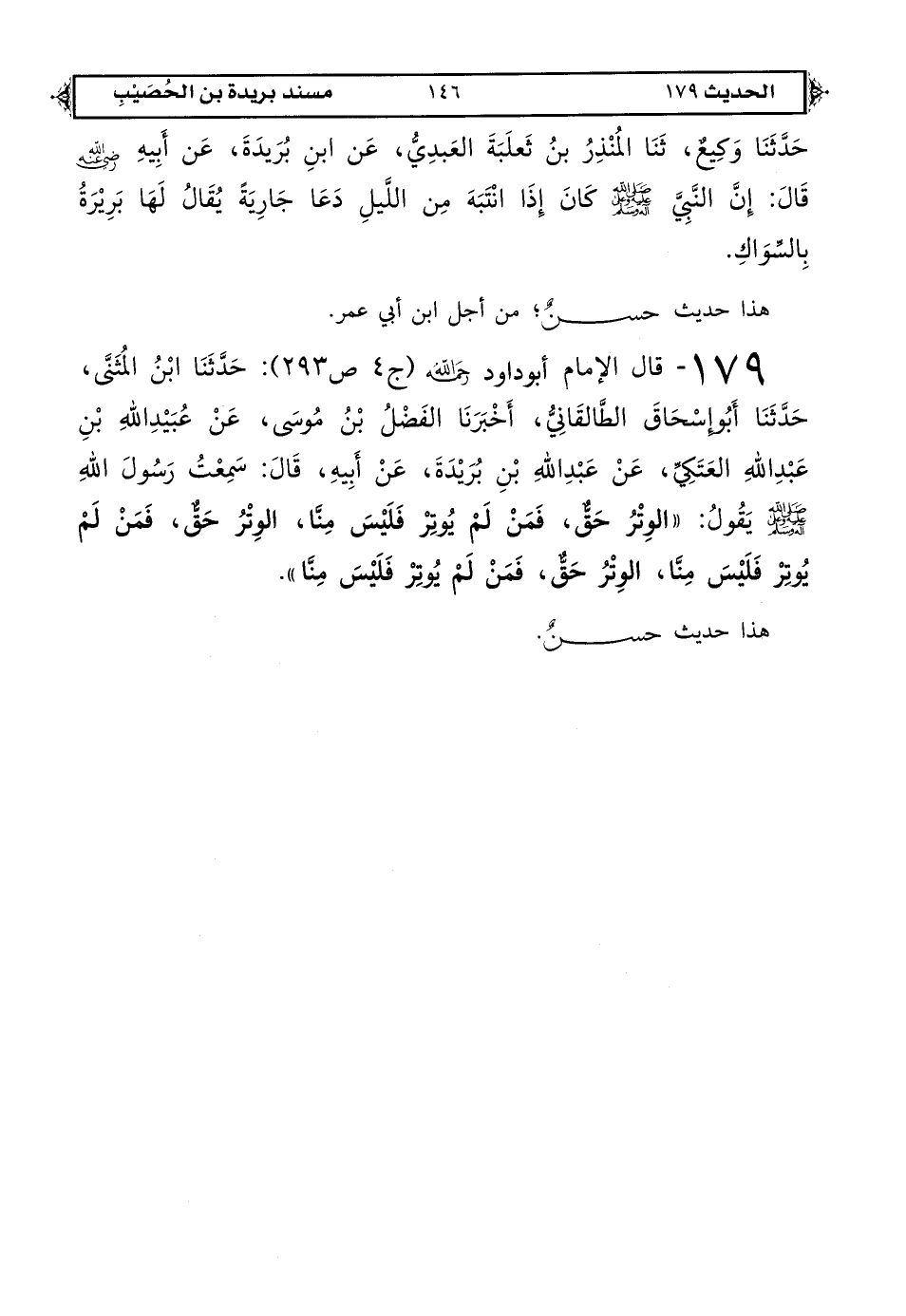 179 - قال الإمام أبو داود رحمه الله (ج 4 ص 293): حَدَّثَنَا ابْنُ الْمُثَنَّى حَدَّثَنَا أَبُو إِسْحَاقَ الطَّالْقَانِيُّ أخبرَنَا الْفَضْلُ بْنُ مُوسَى عَنْ عُبَيْدِ اللهِ بْنِ عَبْدِ اللهِ الْعَتَكِيِّ عَنْ عَبْدِ اللهِ بْنِ بُرَيْدَةَ عَنْ أَبِيهِ قَالَ: سَمِعْتُ رَسُولَ اللهِ صَلَّى اللهُ عَلَيْهِ وَعَلَى آلِهِ وَسَلَّمَ يَقُولُ «الْوِتْرُ حَقٌّ فَمَنْ لَمْ يُوتِرْ فَلَيْسَ مِنَّا الْوِتْرُ حَقٌّ فَمَنْ لَمْ يُوتِرْ فَلَيْسَ مِنَّا الْوِتْرُ حَقٌّ فَمَنْ لَمْ يُوتِرْ فَلَيْسَ مِنَّا».