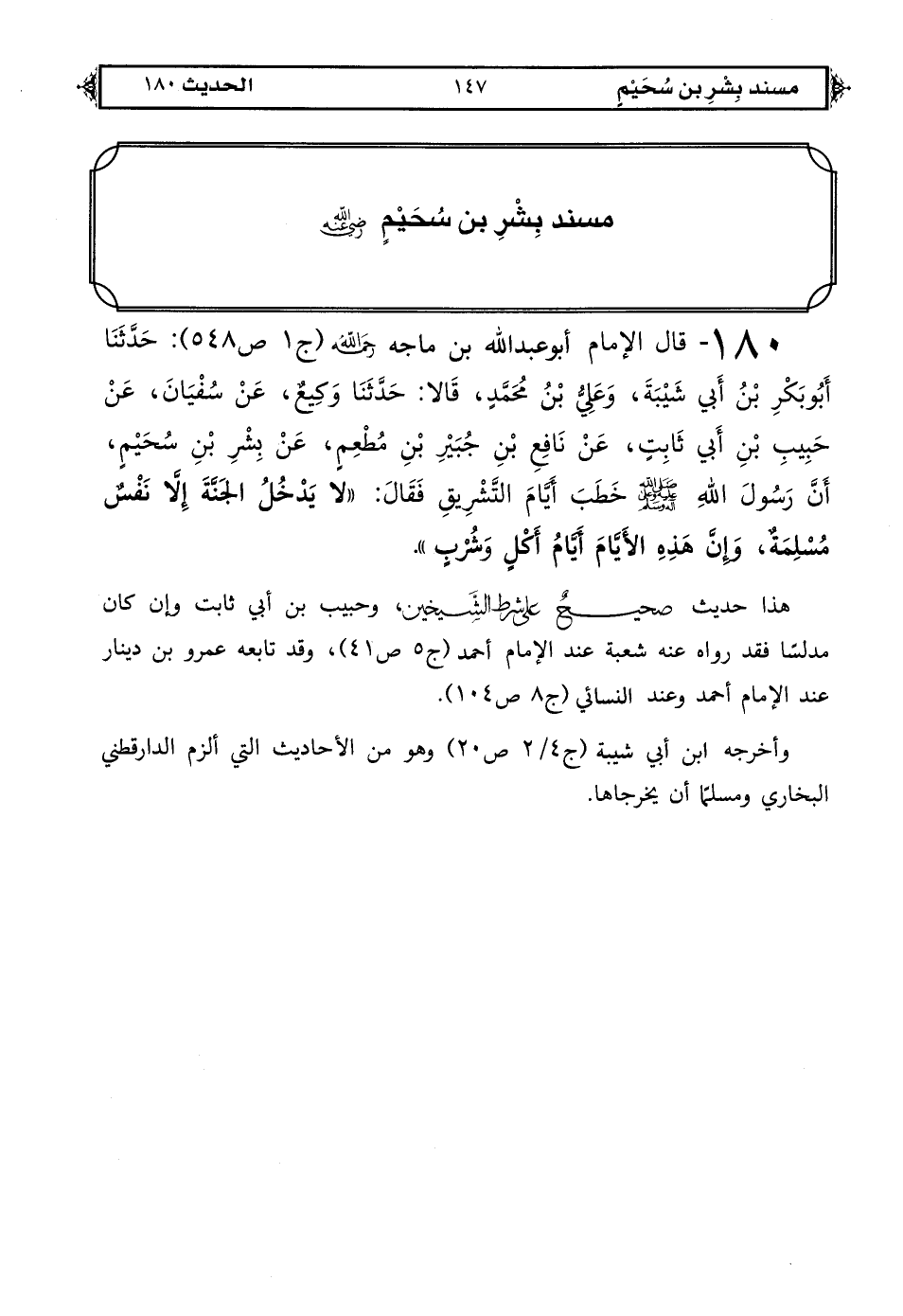 180 - قال الإمام أبو عبد الله بن ماجه رحمه الله (ج 1 ص 548): حَدَّثَنَا أَبُو بَكْرِ بْنُ أَبِي شَيْبَةَ وَعَلِيُّ بْنُ مُحَمَّدٍ قَالَا حَدَّثَنَا وَكِيعٌ عَنْ سُفْيَانَ عَنْ حَبِيبِ بْنِ أَبِي ثَابِتٍ عَنْ نَافِعِ بْنِ جُبَيْرِ بْنِ مُطْعِمٍ عَنْ بِشْرِ بْنِ سُحَيْمٍ: أَنَّ رَسُولَ اللهِ صَلَّى اللهُ عَلَيْهِ وَعَلَى آلِهِ وَسَلَّمَ خَطَبَ أَيَّامَ التَّشْرِيقِ فَقَالَ «لَا يَدْخُلُ الْجَنَّةَ إِلَّا نَفْسٌ مُسْلِمَةٌ وَإِنَّ هَذِهِ الْأَيَّامَ أَيَّامُ أَكْلٍ وَشُرْبٍ».