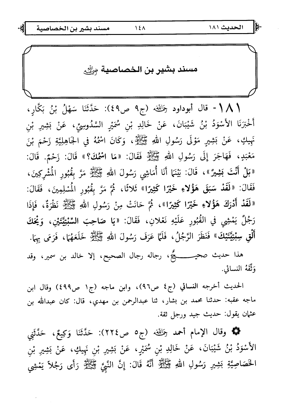 181 - قال أبو داود رحمه الله (ج 9 ص 49): حَدَّثَنَا سَهْلُ بْنُ بَكَّارٍ أخبرَنَا الْأَسْوَدُ بْنُ شَيْبَانَ عَنْ خَالِدِ بْنِ سُمَيْرٍ السَّدُوسِيِّ عَنْ بَشِيرِ بْنِ نَهِيكٍ عَنْ بَشِيرٍ مَوْلَى رَسُولِ اللهِ صَلَّى اللهُ عَلَيْهِ وَعَلَى آلِهِ وَسَلَّمَ -وَكَانَ اسْمُهُ فِي الْجَاهِلِيَّةِ زَحْمَ بْنَ مَعْبَدٍ فَهَاجَرَ إِلَى رَسُولِ اللهِ صَلَّى اللهُ عَلَيْهِ وَعَلَى آلِهِ وَسَلَّمَ فَقَالَ «مَا اسْمُكَ؟ » قَالَ زَحْمٌ قَالَ «بَلْ أَنْتَ بَشِيرٌ» - قَالَ: بَيْنَمَا أَنَا أُمَاشِي رَسُولَ اللهِ صَلَّى اللهُ عَلَيْهِ وَعَلَى آلِهِ وَسَلَّمَ مَرَّ بِقُبُورِ الْمُشْرِكِينَ فَقَالَ «لَقَدْ سَبَقَ هَؤُلَاءِ خَيْرًا كَثِيرًا» ثَلَاثًا ثُمَّ مَرَّ بِقُبُورِ الْمُسْلِمِينَ فَقَالَ «لَقَدْ أَدْرَكَ هَؤُلَاءِ خَيْرًا كَثِيرًا» ثُمَّ حَانَتْ مِنْ رَسُولِ اللهِ صَلَّى اللهُ عَلَيْهِ وَعَلَى آلِهِ وَسَلَّمَ نَظْرَةٌ فَإِذَا رَجُلٌ يَمْشِي فِي الْقُبُورِ عَلَيْهِ نَعْلَانِ فَقَالَ «يَا صَاحِبَ السِّبْتِيَّتَيْنِ وَيْحَكَ أَلْقِ سِبْتِيَّتَيْكَ» فَنَظَرَ الرَّجُلُ فَلَمَّا عَرَفَ رَسُولَ اللهِ صَلَّى اللهُ عَلَيْهِ وَعَلَى آلِهِ وَسَلَّمَ خَلَعَهُمَا فَرَمَى بِهِمَا.
