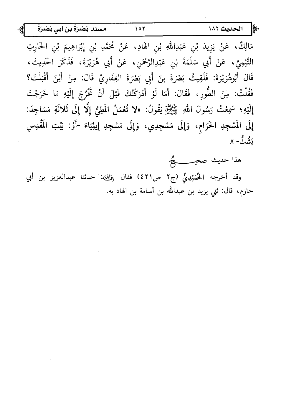1095 - قال الإمام أحمد رحمه الله (ج 4 ص 236): حدثنا عبد الرحمن بن مهدي حدثنا معاوية عن سليم بن عامر عن جبير بن نفير قال: كنا معسكرين مع معاوية بعد قتل عثمان رضي الله عنه فقام كعب بن مرة البهزي فقال: لولا شيء سمعته من رسول الله صلى الله عليه وعلى آله وسلم ما قمت هذا المقام فلما سمع بذكر رسول الله صلى الله عليه وعلى آله وسلم أجلس الناس فقال بينما نحن عند رسول الله صلى الله عليه وعلى آله وسلم إذ مر عثمان بن عفان عليه مرجلًا فقال رسول الله صلى الله عليه وعلى آله وسلم «لتخرجن فتنة من تحت قدمي -أو من بين رجلي- هذا هذا يومئذ ومن اتبعه على الهدى» قال فقام ابن حوالة الأزدي من عند المنبر فقال إنك لصاحب هذا قال نعم قال والله إني لحاضر ذلك المجلس ولو علمت أن لي في الجيش مصدقًا كنت أول من تكلم به.