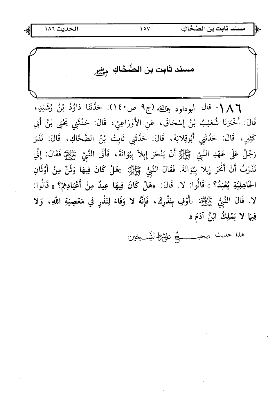 186 - قال أبو داود رحمه الله (ج 9 ص 140): حَدَّثَنَا دَاوُدُ بْنُ رُشَيْدٍ قال أخبرَنَا شُعَيْبُ بْنُ إِسْحَاقَ عَنْ الْأَوْزَاعِيِّ قال حدثني يَحْيَى بْنِ أَبِي كَثِيرٍ قَالَ حَدَّثَنِي أَبُو قِلَابَةَ قَالَ حَدَّثَنِي ثَابِتُ بْنُ الضَّحَّاكِ قَالَ: نَذَرَ رَجُلٌ عَلَى عَهْدِ النَّبِيِّ صَلَّى اللهُ عَلَيْهِ وَعَلَى آلِهِ وَسَلَّمَ أَنْ يَنْحَرَ إِبِلًا بِبُوَانَةَ فَأَتَى النَّبِيَّ صَلَّى اللهُ عَلَيْهِ وَعَلَى آلِهِ وَسَلَّمَ فَقَالَ إِنِّي نَذَرْتُ أَنْ أَنْحَرَ إِبِلًا بِبُوَانَةَ فَقَالَ النَّبِيُّ صَلَّى اللهُ عَلَيْهِ وَعَلَى آلِهِ وَسَلَّمَ «هَلْ كَانَ فِيهَا وَثَنٌ مِنْ أَوْثَانِ الْجَاهِلِيَّةِ يُعْبَدُ؟ » قَالُوا لَا قَالَ «هَلْ كَانَ فِيهَا عِيدٌ مِنْ أَعْيَادِهِمْ؟ » قَالُوا لَا قَالَ النَّبِيُّ صَلَّى اللهُ عَلَيْهِ وَعَلَى آلِهِ وَسَلَّمَ «أَوْفِ بِنَذْرِكَ فَإِنَّهُ لَا وَفَاءَ لِنَذْرٍ فِي مَعْصِيَةِ اللهِ وَلَا فِيمَا لَا يَمْلِكُ ابْنُ آدَمَ».