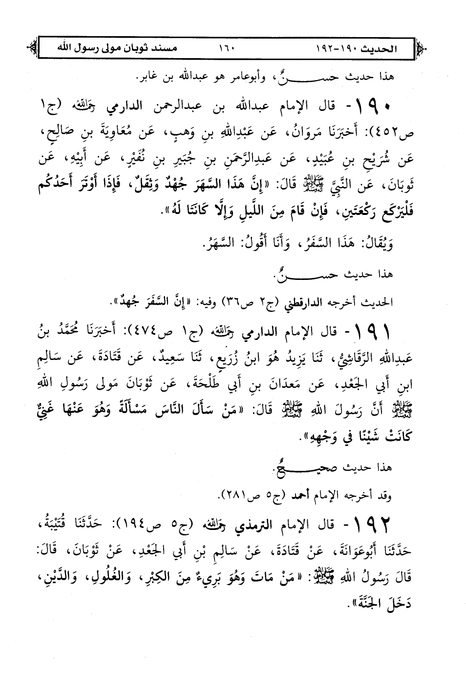 190 - قال الإمام عبد الله بن عبد الرحمن الدارمي رحمه الله (ج 1 ص 452): أخبرنا مروان عن عبد الله بن وهب عن معاوية بن صالح عن شريح بن عبيد عن عبد الرحمن بن جبير بن نفير عن أبيه عن ثوبان: عن النبي صلى الله عليه وعلى آله وسلم قال: «إن هذا السهر جهد وثقل فإذا أوتر أحدكم فليركع ركعتين فإن قام من الليل وإلا كانتا له».