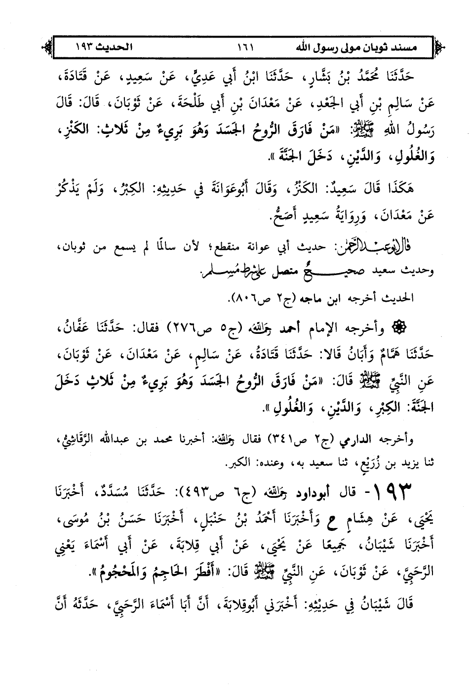 193 - قال أبو داود رحمه الله (ج 6 ص 493): حَدَّثَنَا مُسَدَّدٌ، أخبرَنَا يَحْيَى، عَنْ هِشَامٍ ح وأخبرَنَا أَحْمَدُ بْنُ حَنْبَلٍ، أخبرَنَا حَسَنُ بْنُ مُوسَى، أخبرَنَا شَيْبَانُ، جَمِيعًا عَنْ يَحْيَى، عَنْ أَبِي قِلَابَةَ، عَنْ أَبِي أَسْمَاءَ يَعْنِي الرَّحَبِيَّ، عَنْ ثَوْبَانَ: عَنِ النَّبِيِّ صَلَّى اللهُ عَلَيْهِ وَعَلَى آلِهِ وَسَلَّمَ قَالَ: «أَفْطَرَ الْحَاجِمُ وَالْمَحْجُومُ».