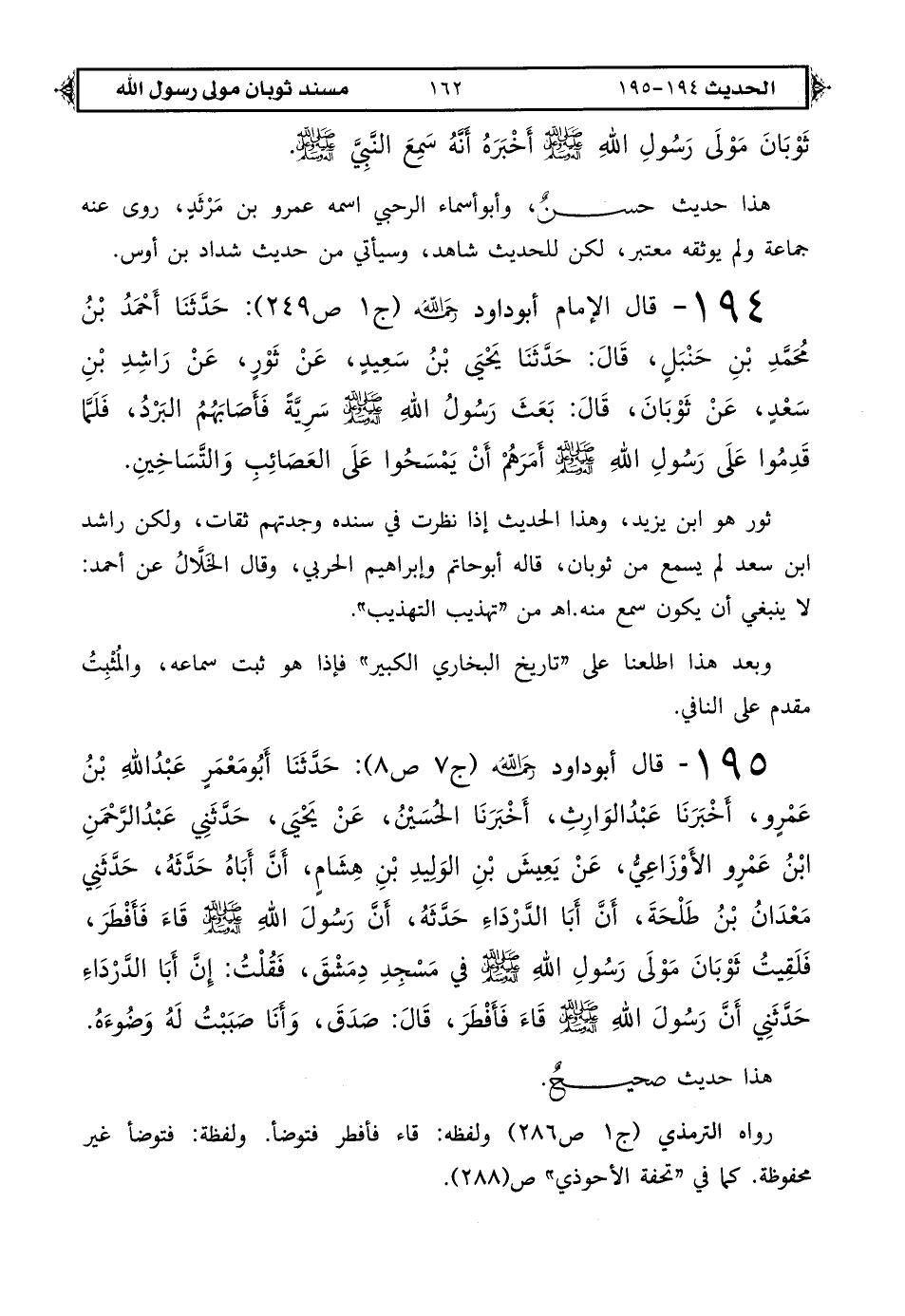 194 - قال الإمام أبو داود رحمه الله (ج 4 ص 249): حَدَّثَنَا أَحْمَدُ بْنُ مُحَمَّدِ بْنِ حَنْبَلٍ حَدَّثَنَا يَحْيَى بْنُ سَعِيدٍ عَنْ ثَوْرٍ عَنْ رَاشِدِ بْنِ سَعْدٍ عَنْ ثَوْبَانَ قَالَ: بَعَثَ رَسُولُ اللهِ صَلَّى اللهُ عَلَيْهِ وَعَلَى آلِهِ وَسَلَّمَ سَرِيَّةً فَأَصَابَهُمْ الْبَرْدُ فَلَمَّا قَدِمُوا عَلَى رَسُولِ اللهِ صَلَّى اللهُ عَلَيْهِ وَعَلَى آلِهِ وَسَلَّمَ أَمَرَهُمْ أَنْ يَمْسَحُوا عَلَى الْعَصَائِبِ وَالتَّسَاخِينِ.