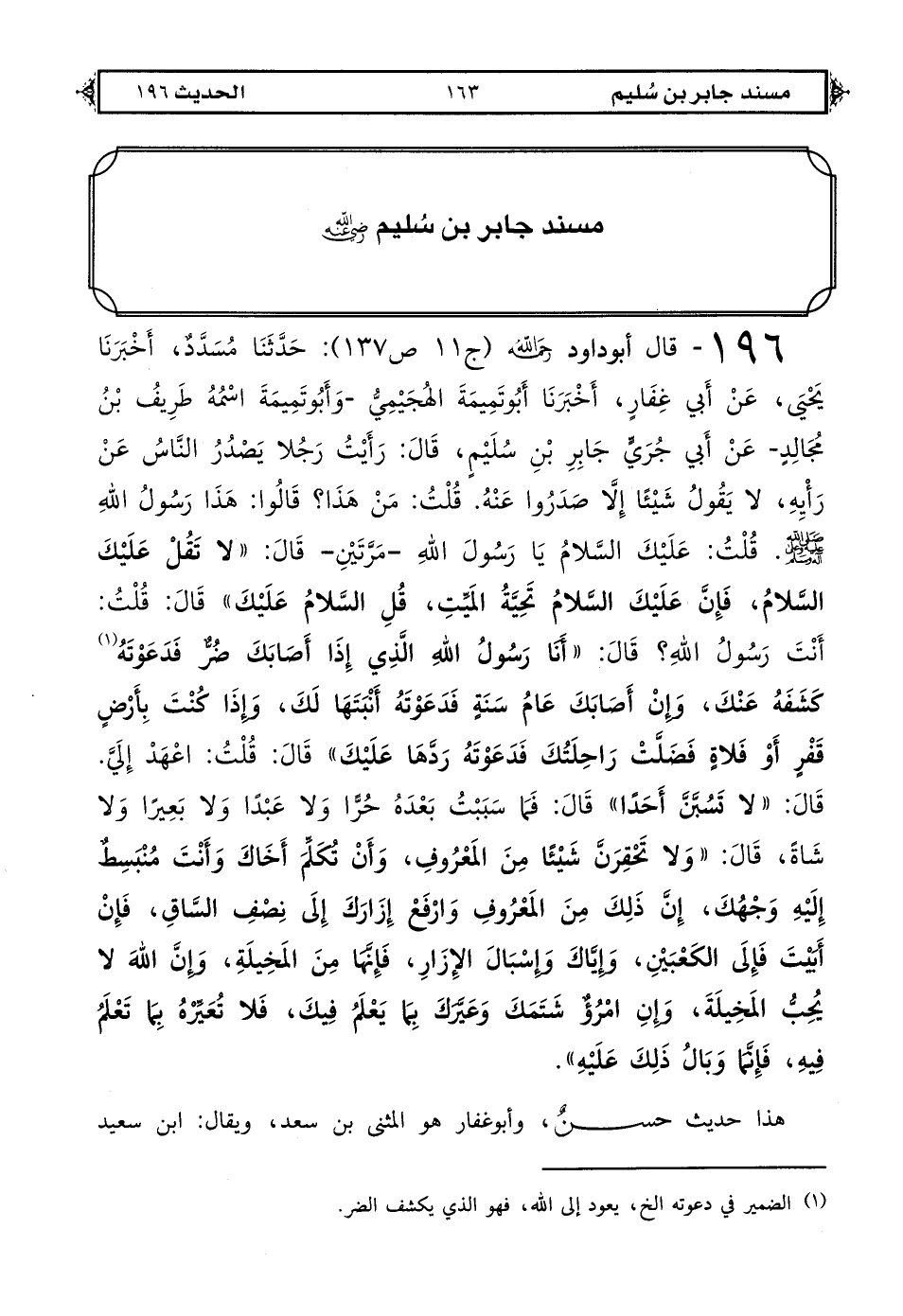 196 - قال أبو داود رحمه الله (ج 11 ص 137): حَدَّثَنَا مُسَدَّدٌ أخبرَنَا يَحْيَى عَنْ أَبِي غِفَارٍ أخبرَنَا أَبُو تَمِيمَةَ الْهُجَيْمِيُّ وَأَبُو تَمِيمَةَ اسْمُهُ طَرِيفُ بْنُ مُجَالِدٍ عَنْ أَبِي جُرَيٍّ جَابِرِ بْنِ سُلَيْمٍ قَالَ: رَأَيْتُ رَجُلًا يَصْدُرُ النَّاسُ عَنْ رَأْيِهِ لَا يَقُولُ شَيْئًا إِلَّا صَدَرُوا عَنْهُ قُلْتُ مَنْ هَذَا قَالُوا هَذَا رَسُولُ اللهِ صَلَّى اللهُ عَلَيْهِ وَعَلَى آلِهِ وَسَلَّمَ قُلْتُ عَلَيْكَ السَّلَامُ يَا رَسُولَ اللهِ مَرَّتَيْنِ قَالَ «لَا تَقُلْ عَلَيْكَ السَّلَامُ فَإِنَّ عَلَيْكَ السَّلَامُ تَحِيَّةُ الْمَيِّتِ قُلْ السَّلَامُ عَلَيْكَ» قَالَ قُلْتُ أَنْتَ رَسُولُ اللهِ قَالَ «أَنَا رَسُولُ اللهِ الَّذِي إِذَا أَصَابَكَ ضُرٌّ فَدَعَوْتَهُ (1) كَشَفَهُ عَنْكَ وَإِنْ أَصَابَكَ عَامُ سَنَةٍ فَدَعَوْتَهُ أَنْبَتَهَا لَكَ وَإِذَا كُنْتَ بِأَرْضٍ قَفْرٍ أَوْ فَلَاةٍ فَضَلَّتْ رَاحِلَتُكَ فَدَعَوْتَهُ رَدَّهَا عَلَيْكَ» قَالَ قُلْتُ اعْهَدْ إِلَيَّ قَالَ «لَا تَسُبَّنَّ أَحَدًا» قَالَ فَمَا سَبَبْتُ بَعْدَهُ حُرًّا وَلَا عَبْدًا وَلَا بَعِيرًا وَلَا شَاةً قَالَ «وَلَا تَحْقِرَنَّ شَيْئًا مِنْ الْمَعْرُوفِ وَأَنْ تُكَلِّمَ أَخَاكَ وَأَنْتَ مُنْبَسِطٌ إِلَيْهِ وَجْهُكَ إِنَّ ذَلِكَ مِنْ الْمَعْرُوفِ وَارْفَعْ إِزَارَكَ إِلَى نِصْفِ السَّاقِ فَإِنْ أَبَيْتَ فَإِلَى الْكَعْبَيْنِ وَإِيَّاكَ وَإِسْبَالَ الْإِزَارِ فَإِنَّهَا مِنْ الْمَخِيلَةِ وَإِنَّ اللهَ لَا يُحِبُّ الْمَخِيلَةَ وَإِنْ امْرُؤٌ شَتَمَكَ وَعَيَّرَكَ بِمَا يَعْلَمُ فِيكَ فَلَا تُعَيِّرْهُ بِمَا تَعْلَمُ فِيهِ فَإِنَّمَا وَبَالُ ذَلِكَ عَلَيْهِ».