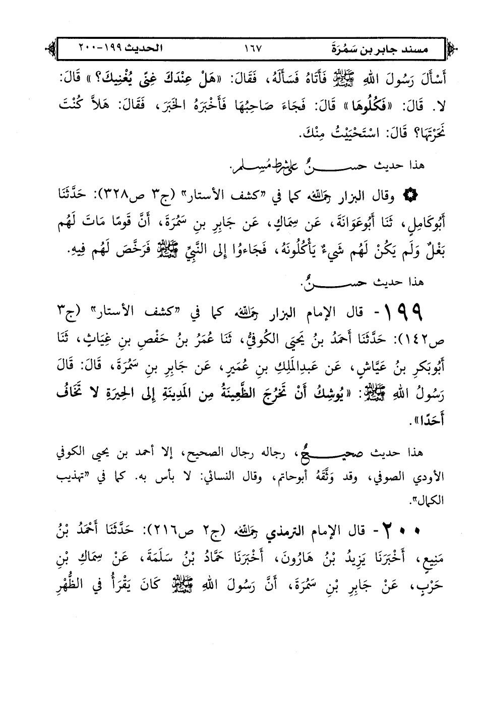 199 - قال الإمام البزار رحمه الله كما في "كشف الأستار" (ج 3 ص 142): حَدَّثَنَا أَحْمَدُ بْنُ يَحْيَى الْكُوفِيُّ، ثَنَا عُمَرُ بْنُ حَفْصِ بْنِ غِيَاثٍ، ثَنَا أَبُو بَكْرِ بْنُ عَيَّاشٍ، عَنْ عَبْدِ الْمَلِكِ بْنِ عُمَيْرٍ، عَنْ جَابِرِ بْنِ سَمُرَةَ، قَالَ: قَالَ رَسُولُ اللهِ صَلَّى اللهُ عَلَيْهِ وَعَلَى آلِهِ وَسَلَّمَ: «يُوشِكُ أَنْ تَخْرُجَ الظَّعِينَةُ مِنَ الْمَدِينَةِ إِلَى الْحِيرَةِ لَا تَخَافُ أَحَدًا».