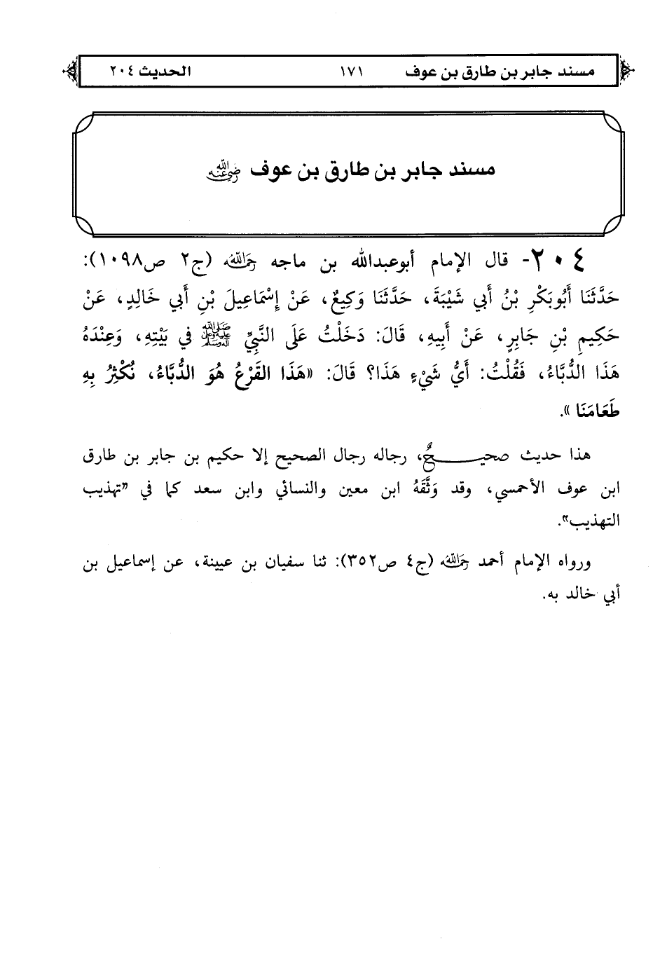 204 - قال الإمام أبو عبد الله بن ماجه رحمه الله (ج 2 ص 1098): حدثنا أبو بكر بن أبي شيبة حدثنا وكيع عن إسماعيل بن أبي خالد عن حكيم بن جابر عن أبيه قال: دخلت على النبي صلى الله عليه وعلى آله وسلم في بيته وعنده هذا الدباء فقلت أي شيء هذا قال «هذا القرع هو الدباء نكثر به طعامنا».