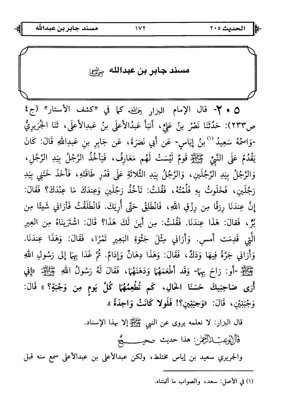 205 - قال الإمام البزار رحمه الله كما في "كشف الأستار" (ج 4 ص 233): حدثنا نصر بن علي، أنبأ عبد الأعلى بن عبد الأعلى، ثنا الجريري -واسمه سعيد (1) بن إياس-، عن أبي نضرة، عن جابر بن عبد الله، قال: كان يقدم على النبي صلى الله عليه وعلى آله وسلم قوم ليست لهم معارف، فيأخذ الرجل بيد الرجل، والرجل بيد الرجلين، والرجل بيد الثلاثة على قدر طاقته، فأخذ ختني بيد رجلين، فخلوت به فلمته، فقلت: تأخذ رجلين وعندك ما عندك؟ فقال: إن عندنا رزقًا من رزق الله، فانطلق حتى أريك. فانطلقت فأراني شيئًا من بر، فقال: هذا عندنا. فقلت: من أين لك هذا؟ قال: اشتريناه من العير التي قدمت أمس. وأراني مثل جثوة البعير تمرًا، فقال: وهذا عندنا. وأراني جرة فيها ودك، فقال: وهذا دهان وإدام. ثم غدا بهما إلى رسول الله صلى الله عليه وعلى آله وسلم -أو: راح بهما- وقد أطعمهما ودهنهما، فقال له رسول الله صلى الله عليه وعلى آله وسلم: «إني أرى صاحبيك حسنا الحال، كم تطعمهما كل يوم من وجبة؟ » قال: وجبتين. قال: «وجبتين! فلولا كانت واحدة».