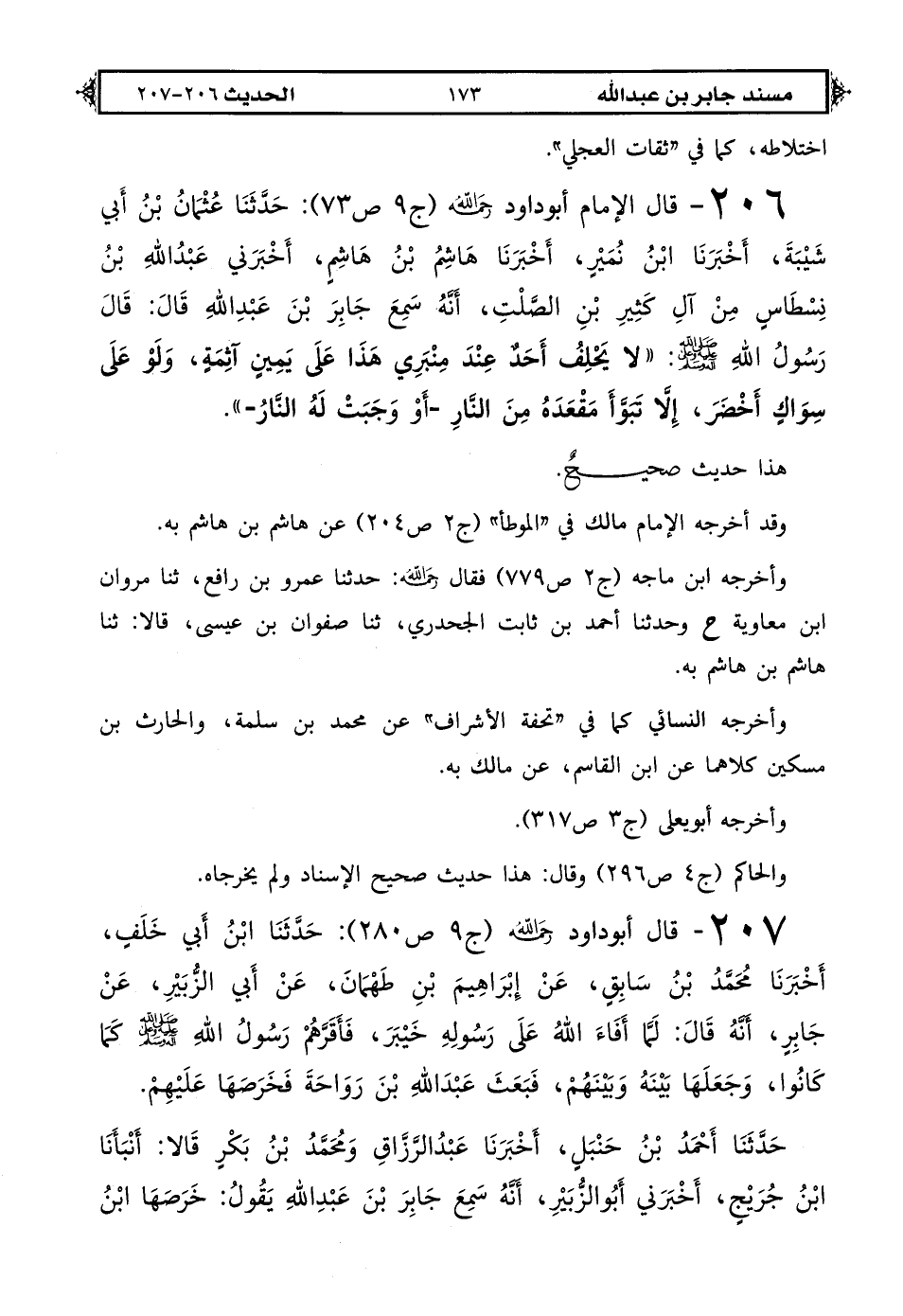 206 - قال الإمام أبو داود رحمه الله (ج 9 ص 73): حدثنا عثمان بن أبي شيبة أخبرنا ابن نمير أخبرنا هاشم بن هاشم أخبرني عبد الله بن نسطاس من آل كثير بن الصلت أنه سمع جابر بن عبد الله قال: قال رسول الله صلى الله عليه وعلى آله وسلم «لا يحلف أحد عند منبري هذا على يمين آثمة ولو على سواك أخضر إلا تبوأ مقعده من النار -أو وجبت له النار-».
