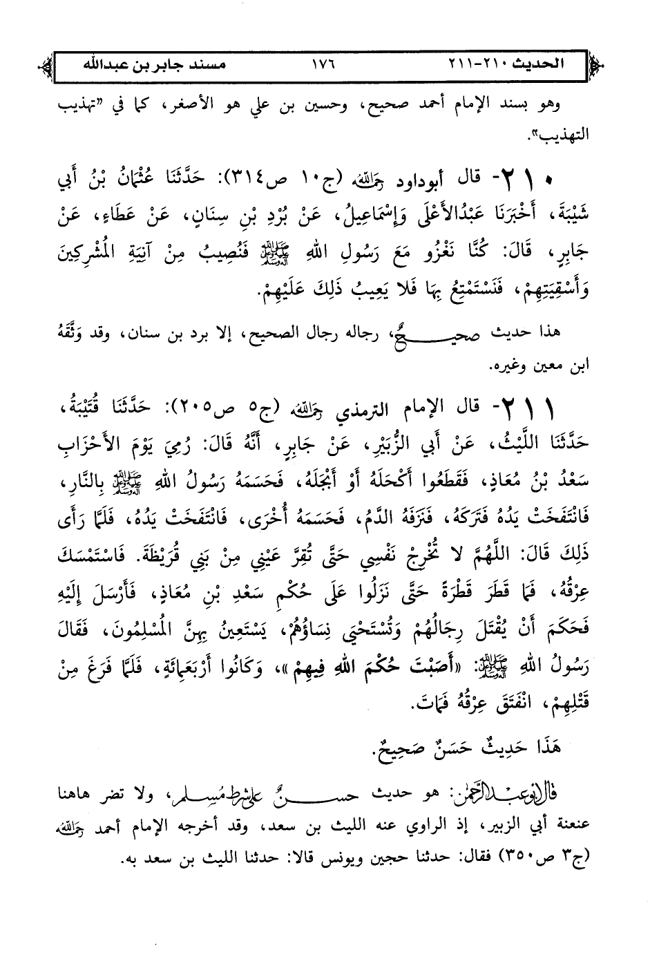 211 - قال الإمام الترمذي رحمه الله (ج 5 ص 205): حدثنا قتيبة حدثنا الليث عن أبي الزبير عن جابر أنه قال: رمي يوم الأحزاب سعد بن معاذ فقطعوا أكحله أو أبجله فحسمه رسول الله صلى الله عليه وعلى آله وسلم بالنار فانتفخت يده فتركه فنزفه الدم فحسمه أخرى فانتفخت يده فلما رأى ذلك قال اللهم لا تخرج نفسي حتى تقر عيني من بني قريظة فاستمسك عرقه فما قطر قطرة حتى نزلوا على حكم سعد بن معاذ فأرسل إليه فحكم أن يقتل رجالهم وتستحيى نساؤهم يستعين بهن المسلمون فقال رسول الله صلى الله عليه وعلى آله وسلم «أصبت حكم الله فيهم» وكانوا أربعمائة فلما فرغ من قتلهم انفتق عرقه فمات.