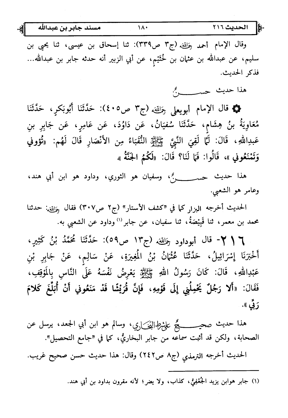 216 - قال أبو داود رحمه الله (ج 13 ص 59): حدثنا محمد بن كثير أخبرنا إسرائيل حدثنا عثمان بن المغيرة عن سالم عن جابر بن عبد الله: قال كان رسول الله صلى الله عليه وعلى آله وسلم يعرض نفسه على الناس بالموقف فقال «ألا رجل يحملني إلى قومه فإن قريشًا قد منعوني أن أبلغ كلام ربي».
