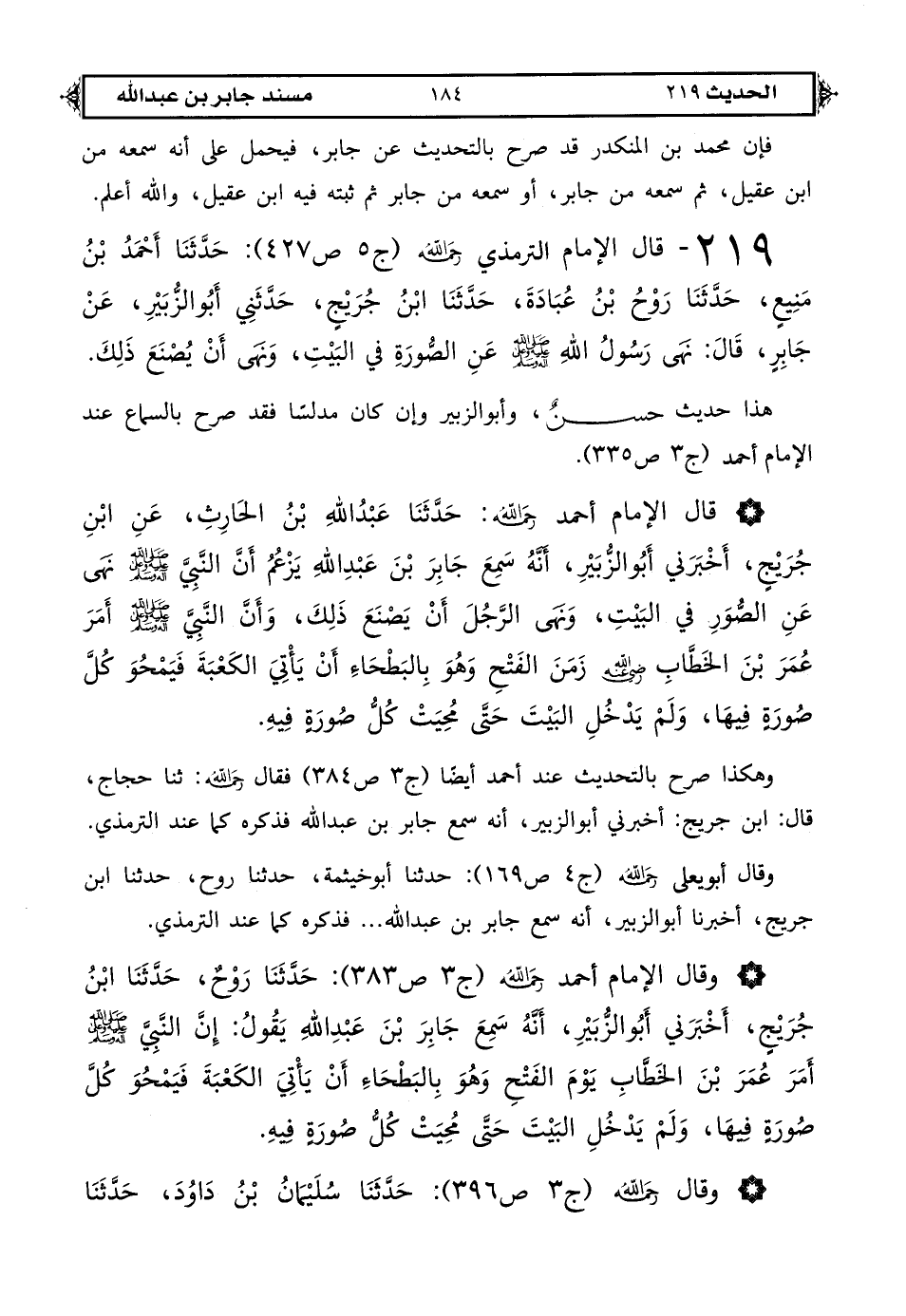 * وقال الإمام أحمد رحمه الله (ج 3 ص 383): حدثنا روح حدثنا ابن جريج أخبرني أبو الزبير أنه سمع جابر بن عبد الله يقول: إن النبي صلى الله عليه وعلى آله وسلم أمر عمر بن الخطاب يوم الفتح وهو بالبطحاء أن يأتي الكعبة فيمحو كل صورة فيها ولم يدخل البيت حتى محيت كل صورة فيه.