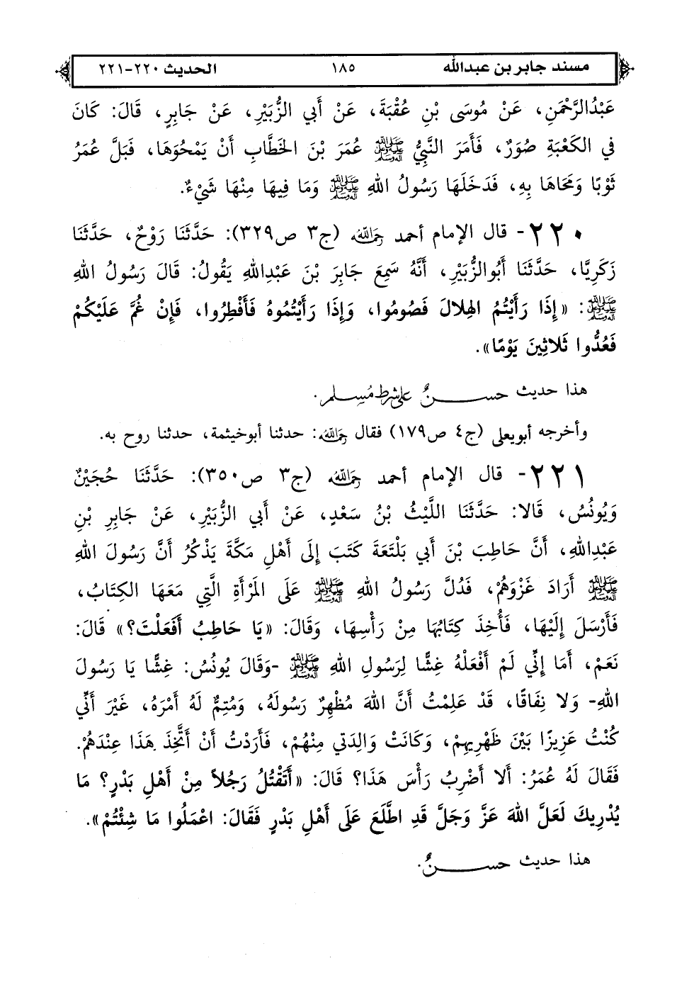 220 - قال الإمام أحمد رحمه الله (ج 3 ص 329): حدثنا روح حدثنا زكريا حدثنا أبو الزبير أنه سمع جابر بن عبد الله يقول: قال رسول الله صلى الله عليه وعلى آله وسلم «إذا رأيتم الهلال فصوموا وإذا رأيتموه فأفطروا فإن غم عليكم فعدوا ثلاثين يومًا».