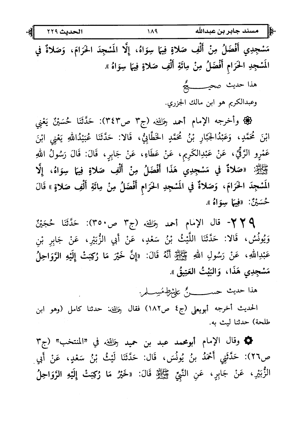 229 - قال الإمام أحمد رحمه الله (ج 3 ص 350): حدثنا حجين ويونس قالا حدثنا الليث بن سعد عن أبي الزبير عن جابر بن عبد الله عن رسول الله صلى الله عليه وعلى آله وسلم أنه قال «إن خير ما ركبت إليه الرواحل مسجدي هذا والبيت العتيق».
