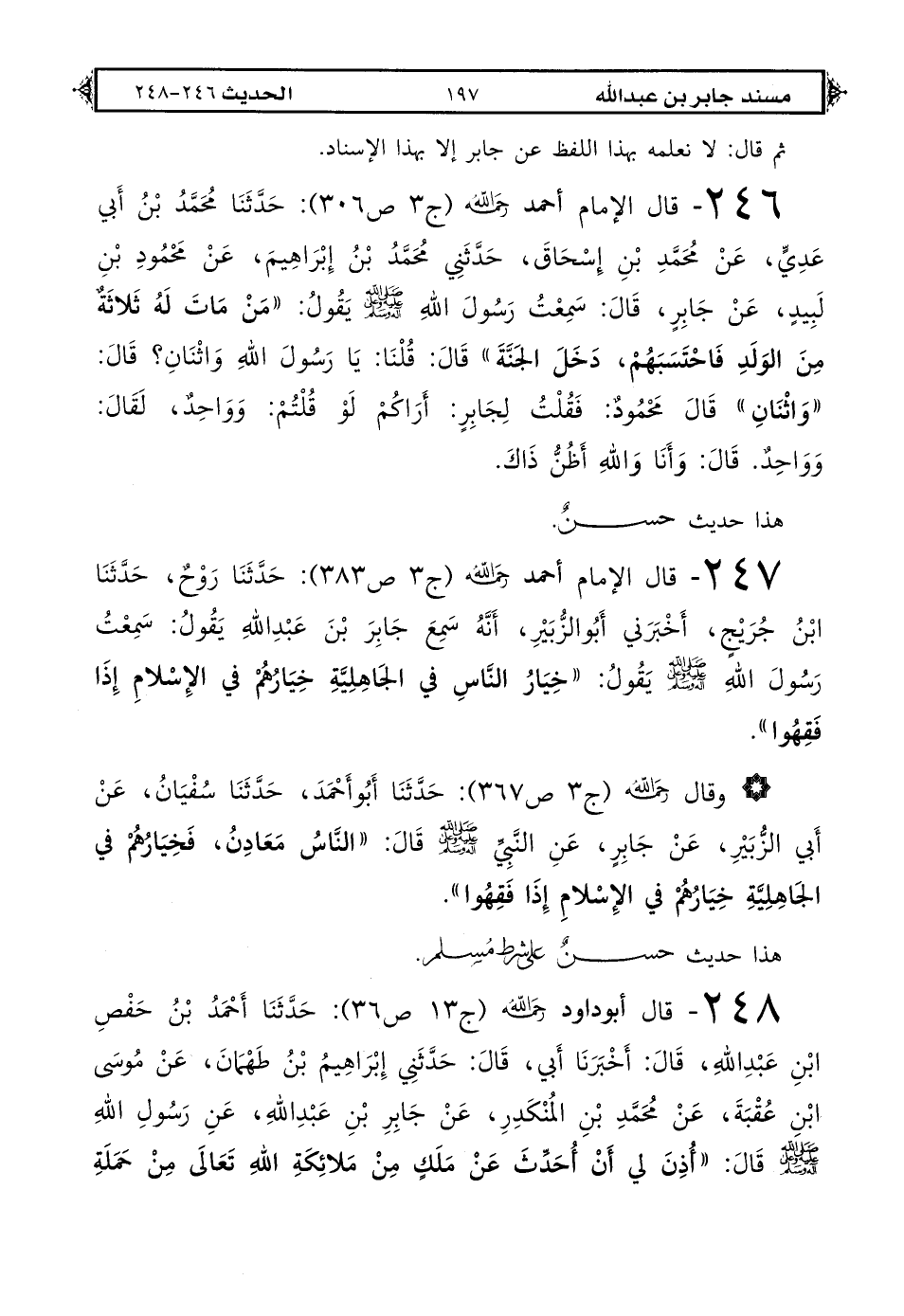246 - قال الإمام أحمد رحمه الله (ج 3 ص 306): حدثنا محمد بن أبي عدي عن محمد بن إسحاق حدثني محمد بن إبراهيم عن محمود بن لبيد عن جابر قال: سمعت رسول الله صلى الله عليه وعلى آله وسلم يقول «من مات له ثلاثة من الولد فاحتسبهم دخل الجنة» قال قلنا يا رسول الله واثنان قال «واثنان». قال محمود فقلت لجابر أراكم لو قلتم وواحد لقال وواحد قال وأنا والله أظن ذاك.