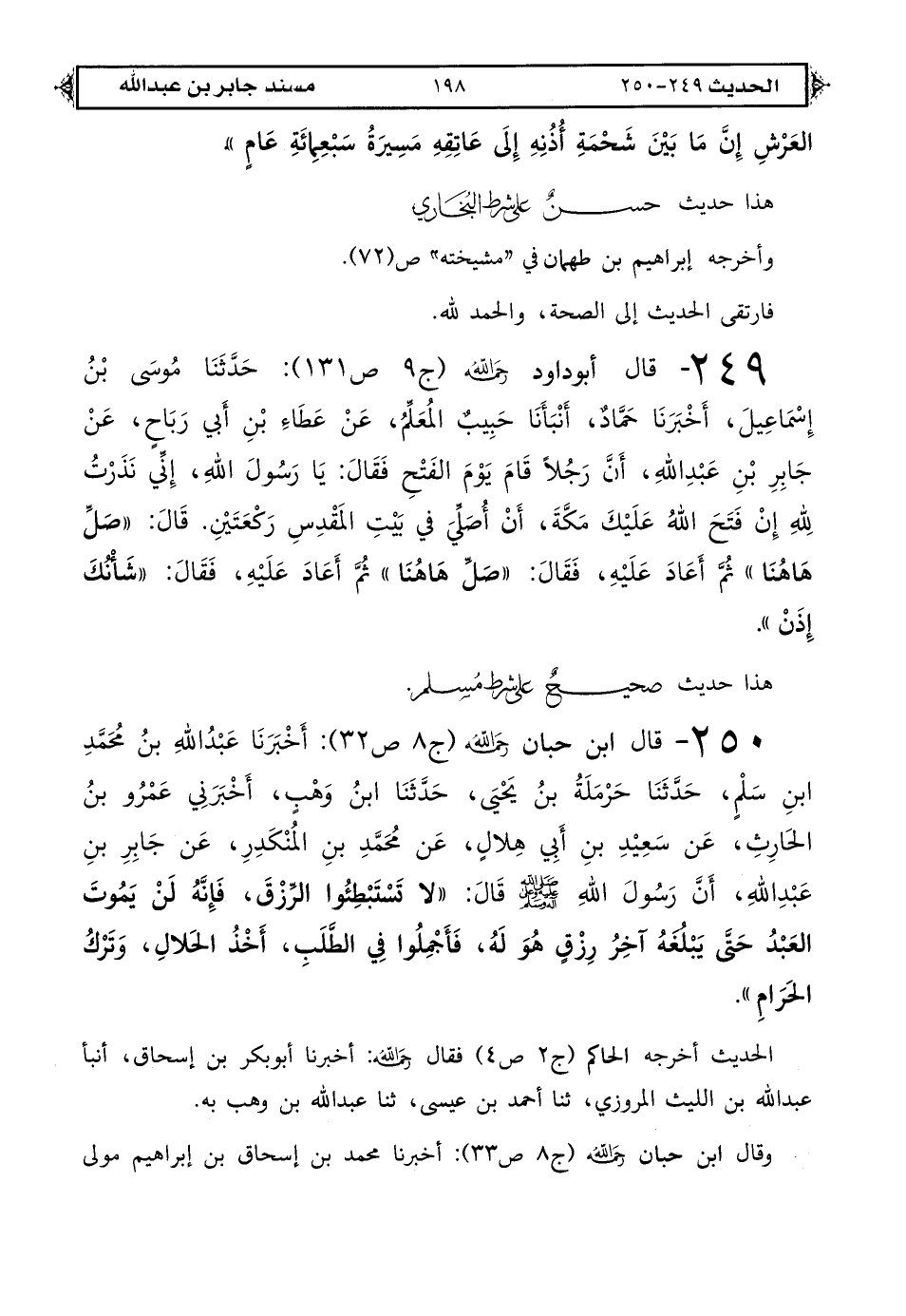 250 - قال ابن حبان رحمه الله (ج 8 ص 32): أخبرنا عبد الله بن محمد بن سلم حدثنا حرملة بن يحيى حدثنا ابن وهب أخبرني عمرو بن الحارث عن سعيد بن أبي هلال عن محمد بن المنكدر عن جابر بن عبد الله: أن رسول الله صلى الله عليه وعلى آله وسلم قال: «لا تستبطئوا الرزق فإنه لن يموت العبد حتى يبلغه آخر رزق هو له فأجملوا في الطلب: أخذ الحلال وترك الحرام».
