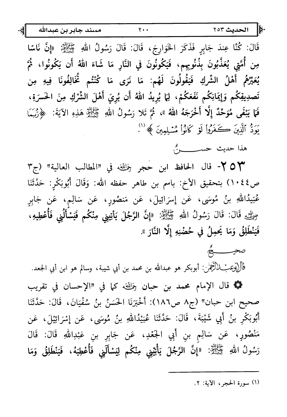 253 - قال الحافظ ابن حجر رحمه الله في "المطالب العالية" (ج 3 ص 1044) بتحقيق الأخ باسم بن طاهر حفظه الله: وقال أبو بكر: حدثنا عبيد الله بن موسى، عن إسرائيل، عن منصور، عن سالم، عن جابر رضي الله عنه، قال: قال رسول الله صلى الله عليه وعلى آله وسلم: «إن الرجل يأتيني منكم فيسألني، فينطلق وما يحمل في حضنه إلا النار».