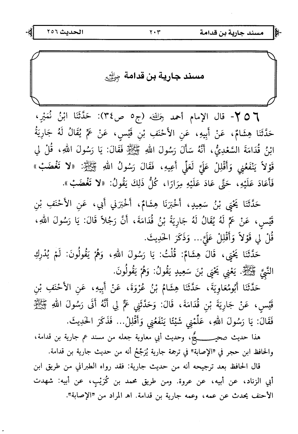 256 - قال الإمام أحمد رحمه الله (ج 5 ص 34): حدثنا ابن نمير حدثنا هشام عن أبيه عن الأحنف بن قيس عن عم يقال له جارية بن قدامة السعدي: أنه سأل رسول الله صلى الله عليه وعلى آله وسلم فقال يا رسول الله قل لي قولًا ينفعني وأقلل علي لعلي أعيه فقال رسول الله صلى الله عليه وعلى آله وسلم «لا تغضب» فأعاد عليه حتى عاد عليه مرارًا كل ذلك يقول «لا تغضب».