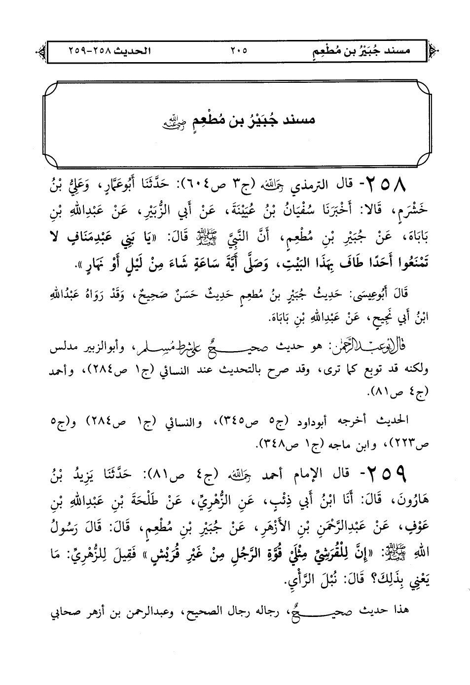 259 - قال الإمام أحمد رحمه الله (ج 4 ص 81): حدثنا يزيد بن هارون قال أنا ابن أبي ذئب عن الزهري عن طلحة بن عبد الله بن عوف عن عبد الرحمن بن الأزهر عن جبير بن مطعم قال: قال رسول الله صلى الله عليه وعلى آله وسلم «إن للقرشي مثلي قوة الرجل من غير قريش». فقيل للزهري ما يعني بذلك قال نبل الرأي.