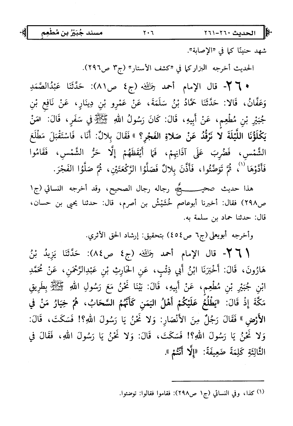 260 - قال الإمام أحمد رحمه الله (ج 4 ص 81): حدثنا عبد الصمد وعفان قالا حدثنا حماد بن سلمة عن عمرو بن دينار عن نافع بن جبير بن مطعم عن أبيه قال: كان رسول الله صلى الله عليه وعلى آله وسلم في سفر قال «من يكلؤنا الليلة لا نرقد عن صلاة الفجر؟ » فقال بلال أنا فاستقبل مطلع الشمس فضرب على آذانهم فما أيقظهم إلا حر الشمس فقاموا فأدوها (1) ثم توضئوا فأذن بلال فصلوا الركعتين ثم صلوا الفجر.