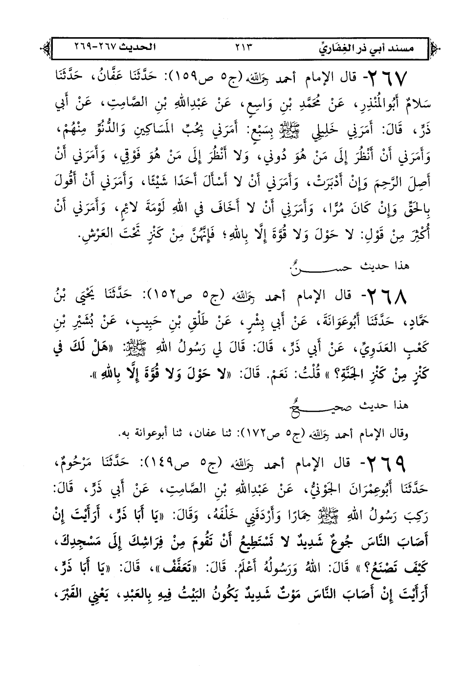 267 - قال الإمام أحمد رحمه الله (ج 5 ص 159): حدثنا عفان حدثنا سلام أبو المنذر عن محمد بن واسع عن عبد الله بن الصامت عن أبي ذر قال: أمرني خليلي صلى الله عليه وعلى آله وسلم بسبع أمرني بحب المساكين والدنو منهم وأمرني أن أنظر إلى من هو دوني ولا أنظر إلى من هو فوقي وأمرني أن أصل الرحم وإن أدبرت وأمرني أن لا أسأل أحدًا شيئًا وأمرني أن أقول بالحق وإن كان مرًّا وأمرني أن لا أخاف في الله لومة لائم وأمرني أن أكثر من قول لا حول ولاقوة إلا بالله فإنهن من كنز تحت العرش.