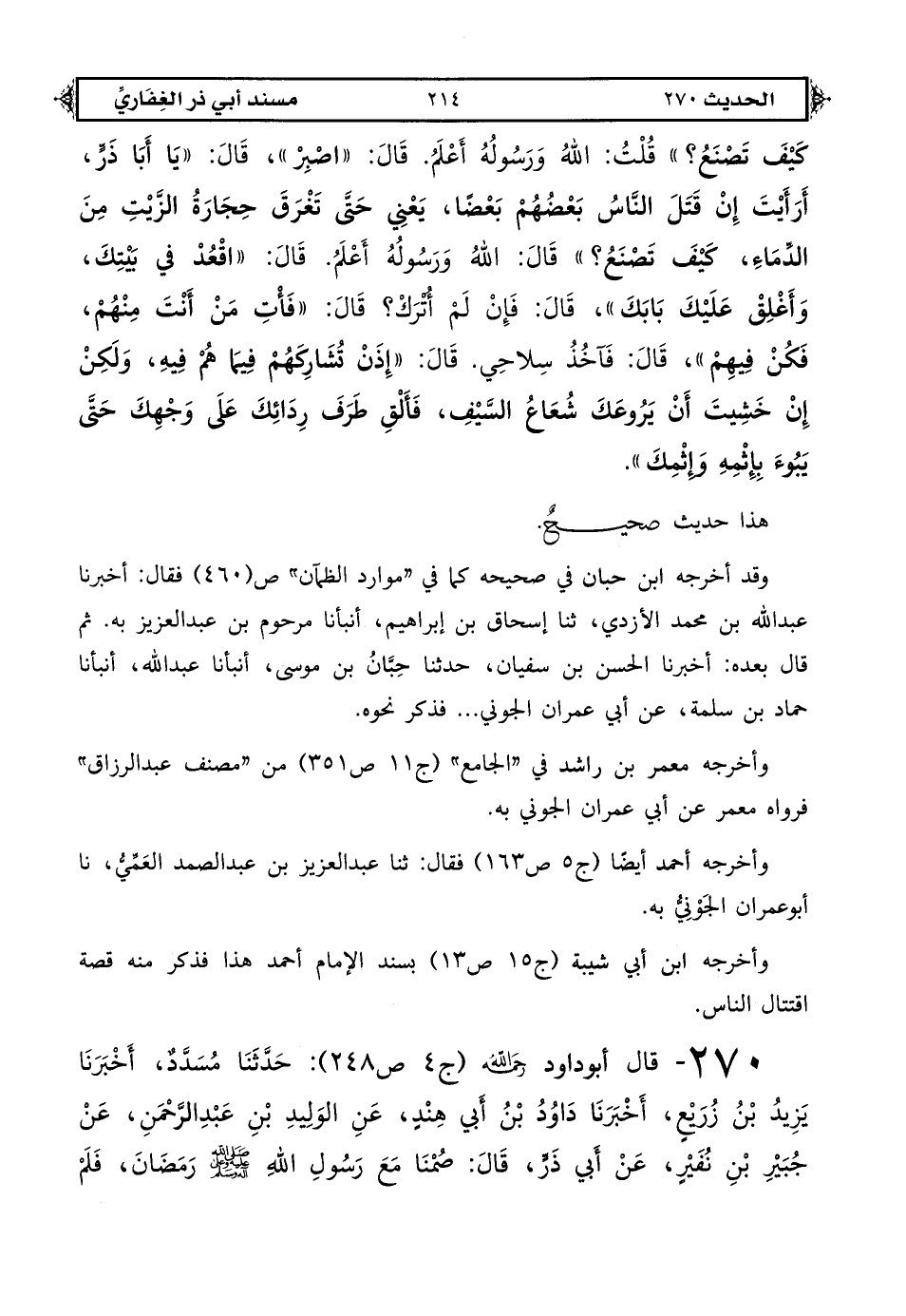 270 - قال أبو داود رحمه الله (ج 4 ص 248): حدثنا مسدد أخبرنا يزيد بن زريع أخبرنا داود بن أبي هند عن الوليد بن عبد الرحمن عن جبير بن نفير عن أبي ذر قال: صمنا مع رسول الله صلى الله عليه وعلى آله وسلم رمضان فلم [ص: 215] يقم بنا شيئًا من الشهر حتى بقي سبع فقام بنا حتى ذهب ثلث الليل فلما كانت السادسة لم يقم بنا فلما كانت الخامسة قام بنا حتى ذهب شطر الليل فقلت يا رسول الله لو نفلتنا قيام هذه الليلة قال فقال «إن الرجل إذا صلى مع الإمام حتى ينصرف حسب له قيام ليلة» قال فلما كانت الرابعة لم يقم فلما كانت الثالثة جمع أهله ونساءه والناس فقام بنا حتى خشينا أن يفوتنا الفلاح قال قلت وما الفلاح قال السحور ثم لم يقم بنا بقية الشهر.