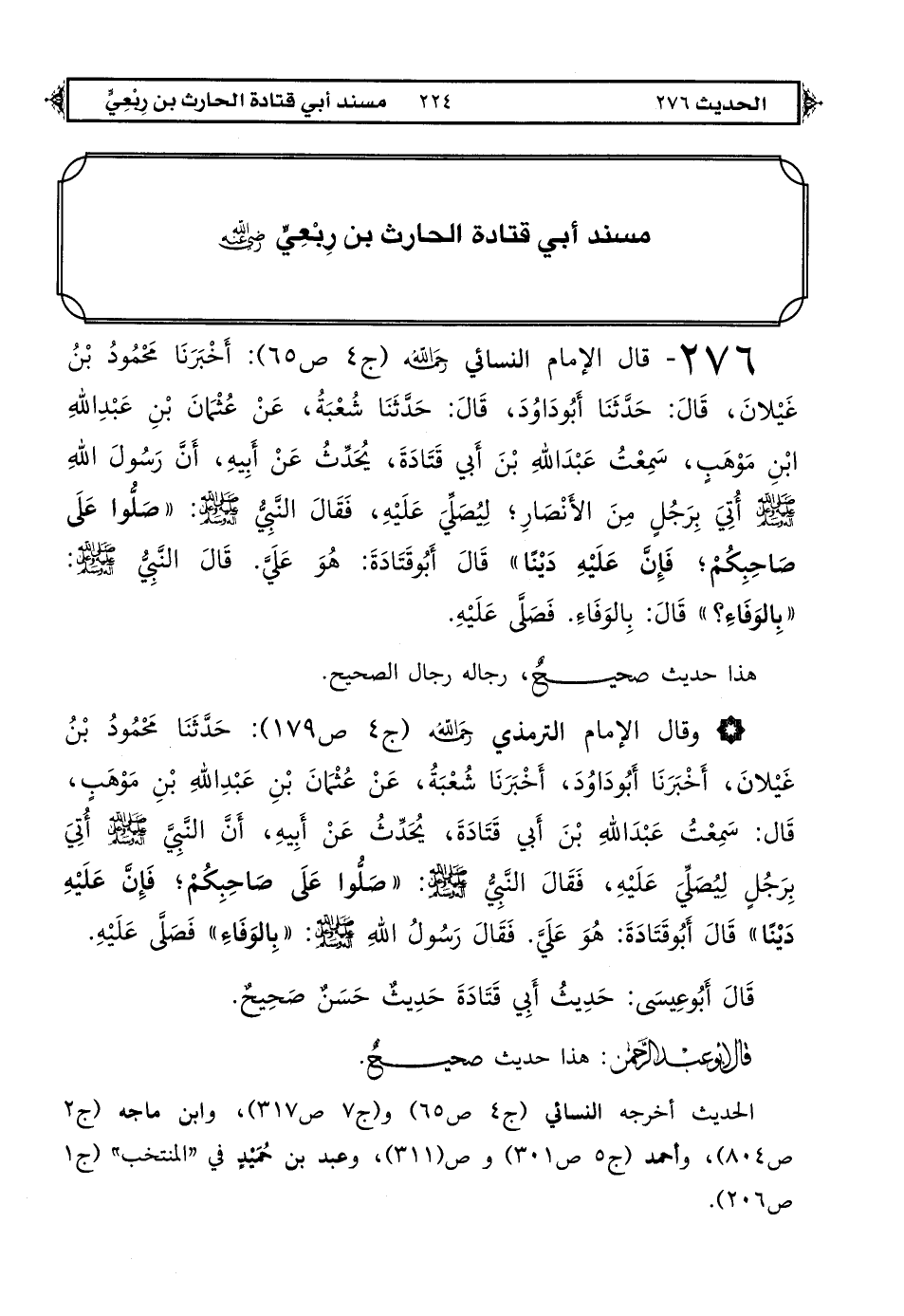 276 - قال الإمام النسائي رحمه الله (ج 4 ص 65): أَخْبَرَنَا مَحْمُودُ بْنُ غَيْلَانَ قَالَ حَدَّثَنَا أَبُو دَاوُدَ قَالَ حَدَّثَنَا شُعْبَةُ عَنْ عُثْمَانَ بْنِ عَبْدِ اللهِ بْنِ مَوْهَبٍ سَمِعْتُ عَبْدَ اللهِ بْنَ أَبِي قَتَادَةَ يُحَدِّثُ عَنْ أَبِيهِ: أَنَّ رَسُولَ اللهِ صَلَّى اللهُ عَلَيْهِ وَعَلَى آلِهِ وَسَلَّمَ أُتِيَ بِرَجُلٍ مِنْ الْأَنْصَارِ لِيُصَلِّيَ عَلَيْهِ فَقَالَ النَّبِيُّ صَلَّى اللهُ عَلَيْهِ وَعَلَى آلِهِ وَسَلَّمَ «صَلُّوا عَلَى صَاحِبِكُمْ فَإِنَّ عَلَيْهِ دَيْنًا» قَالَ أَبُو قَتَادَةَ هُوَ عَلَيَّ قَالَ النَّبِيُّ صَلَّى اللهُ عَلَيْهِ وَعَلَى آلِهِ وَسَلَّمَ «بِالْوَفَاءِ؟ » قَالَ بِالْوَفَاءِ فَصَلَّى عَلَيْهِ.