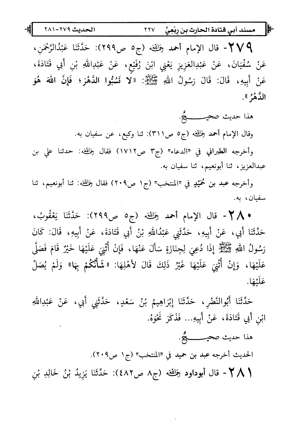279 - قال الإمام أحمد رحمه الله (ج 5 ص 299): حدثنا عبد الرحمن عن سفيان عن عبد العزيز يعني ابن رفيع عن عبد الله بن أبي قتادة عن أبيه قال: قال رسول الله صلى الله عليه وعلى آله وسلم «لا تسبوا الدهر فإن الله هو الدهر».