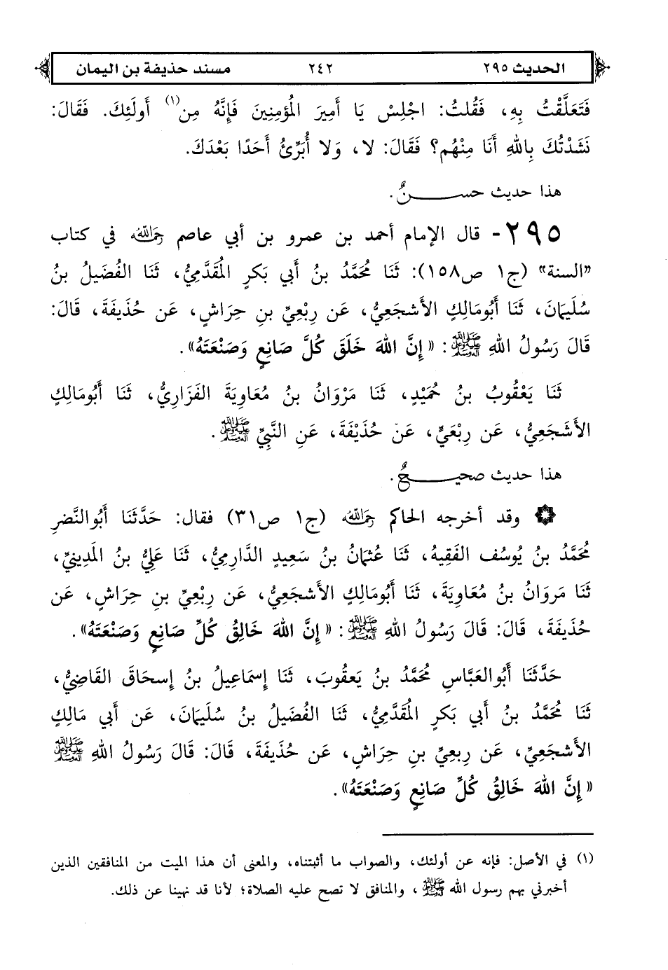 295 - قال الإمام أحمد بن عمرو بن أبي عاصم رحمه الله في كتاب "السنة" (ج 1 ص 158): ثنا محمد بن أبي بكر المقدمي ثنا الفضيل بن سليمان ثنا أبو مالك الأشجعي عن ربعي بن حراش عن حذيفة قال: قال رسول الله صلى الله عليه وعلى آله وسلم «إن الله خلق كل صانع وصنعته».