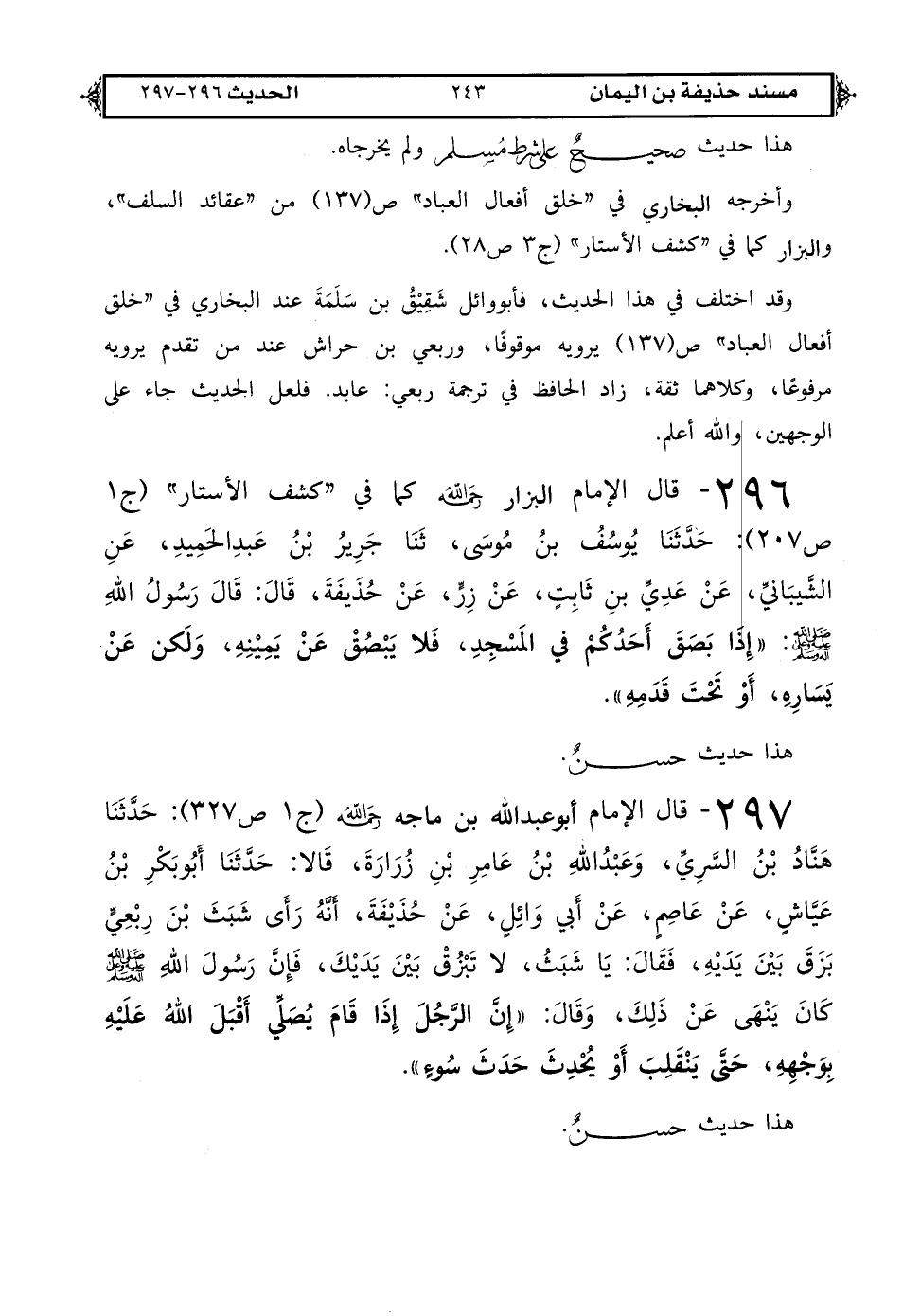 296 - قال الإمام البزار رحمه الله كما في "كشف الأستار" (ج 1 ص 207): حَدَّثَنَا يُوسُفُ بْنُ مُوسَى، ثَنَا جَرِيرُ بْنُ عَبْدِ الْحَمِيدِ، عَنِ الشَّيْبَانِيِّ، عَنْ عَدِيِّ بْنِ ثَابِتٍ، عَنْ زِرٍّ، عَنْ حُذَيْفَةَ، قَالَ: قَالَ رَسُولُ اللهِ صَلَّى اللهُ عَلَيْهِ وَعَلَى آلِهِ وَسَلَّمَ: «إِذَا بَصَقَ أَحَدُكُمْ فِي الْمَسْجِدِ فَلا يَبْصُقْ عَنْ يَمِينِهِ، وَلَكِنْ عَنْ يَسَارِهِ أَوْ تَحْتَ قَدَمِهِ».
